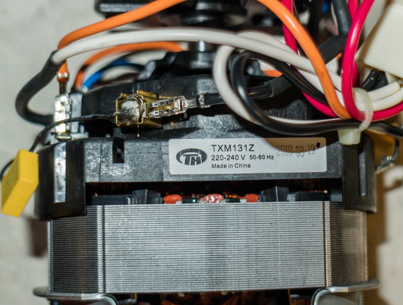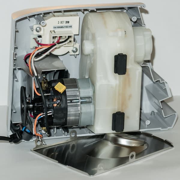 После внешнего осмотра моторный блок был разобран. Корпус мясорубки скреплён четырьмя саморезами с экзотическим, но любимым в Panasonic шлицем TR20 («торкс с дырочкой»). Традиционно добраться до крепежа, расположенного в глубине отверстий на корпусе, можно только длинной отвёрткой, так как стандартный держатель для бит туда не заходит. Особую остроту квесту по разборке устройства придаёт одноразовый язычок-защелка на задней стенке, судя по всему, призванный при случае освободить производителя от тяжких пут гарантийных обязательств. Язычок, к счастью, всего один и он легко отжимается длинной плоской отвёрткой через щель между аккуратно раздвинутыми половинками корпуса.