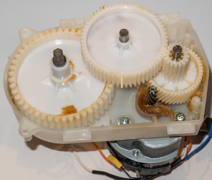Внутри механизма ничего экстраординарного мы не обнаружили: мотор, блок управления и трёхступенчатый редуктор. Собрано всё аккуратно, без заусенцев и следов от клеевого пистолета. Редуктор, хотя и набран из пластмассовых шестерней, впечатляет исполинским размером последней — обычно они процентов на 15-20 меньше.