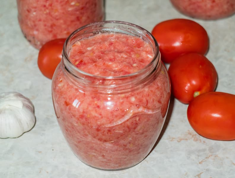 2 кг томатов, 400 г корня хрена, 200 г чеснока, 3 ст. л. соли