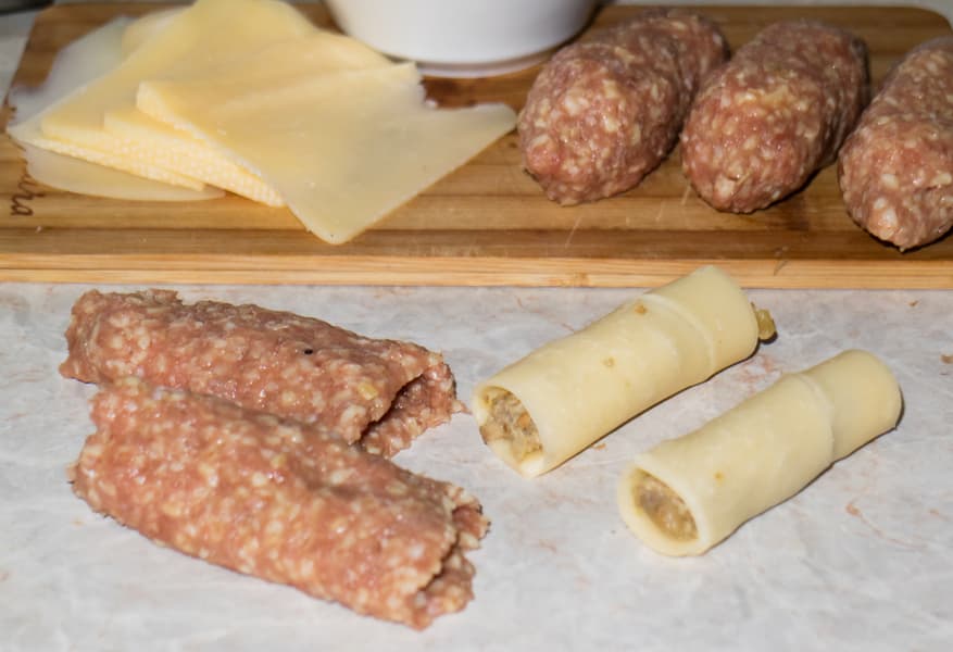 Пока фарш охлаждался, приготовили начинку. Обжарили лук с мелко нарезанными грибами и постарались нарезать сыр тоненькими пластинами. Когда грибы остыли, подготовили начинку для фарширования: ложечку грибов клали в центр ломтика сыра и сворачивали в трубочку.