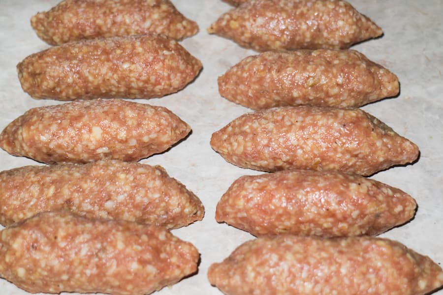 Установили в мясорубку насадку для кеббе и приступили к созданию полых цилиндров. Когда оболочка достигала нужной длины, мы отрезали ее ножом. Можно зажимать край, тем самым также отрывая на нужной длине.
