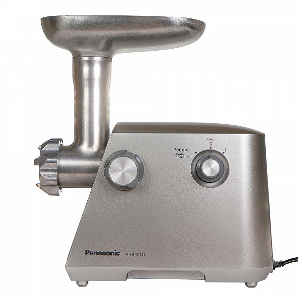 Мясорубка Panasonic MK-GM1701 выглядит очень прилично и аккуратно. Пластиковый корпус, на первый взгляд, производит впечатление металлического — таковы качество покраски пластика и удачный, полностью идентичный металлику, цвет. Форма стандартна — трапеция основанием вниз, что придает устойчивость и надежность всей конструкции. Насадка крепится с торца левой стороны. На передней стороне моторного блока находится фиксирующий винт и переключатель режимов.