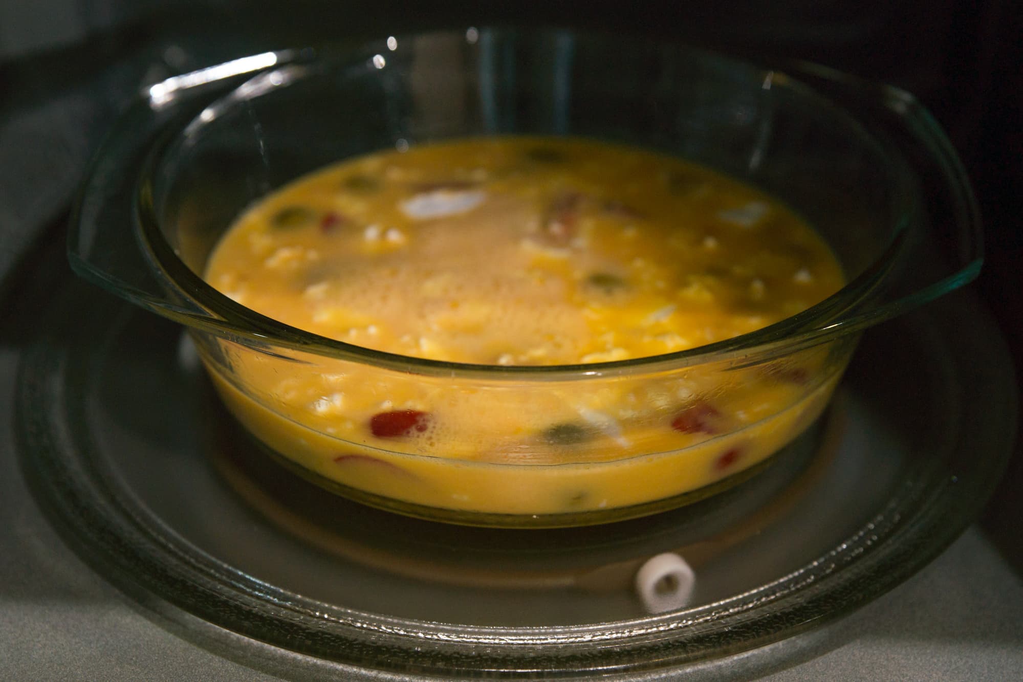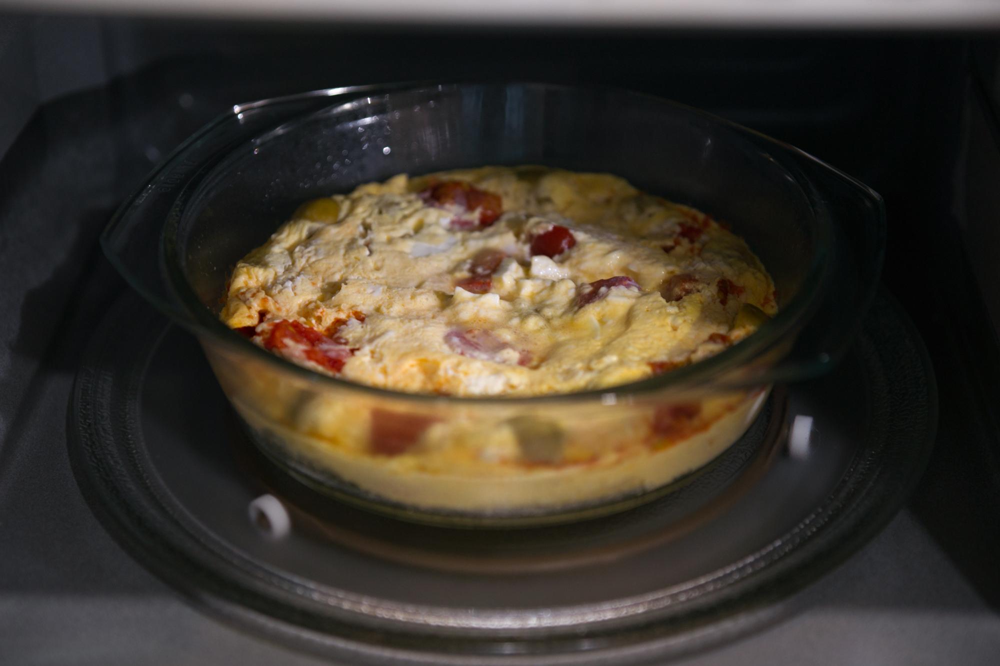 Вылили яичную смесь в стеклянную форму, накрыли крышкой и отправили в микроволновку. Уже через 3 с лишним минуты на максимальной мощности омлет хорошо схватился по краям, но в центре всё еще оставался сырым.