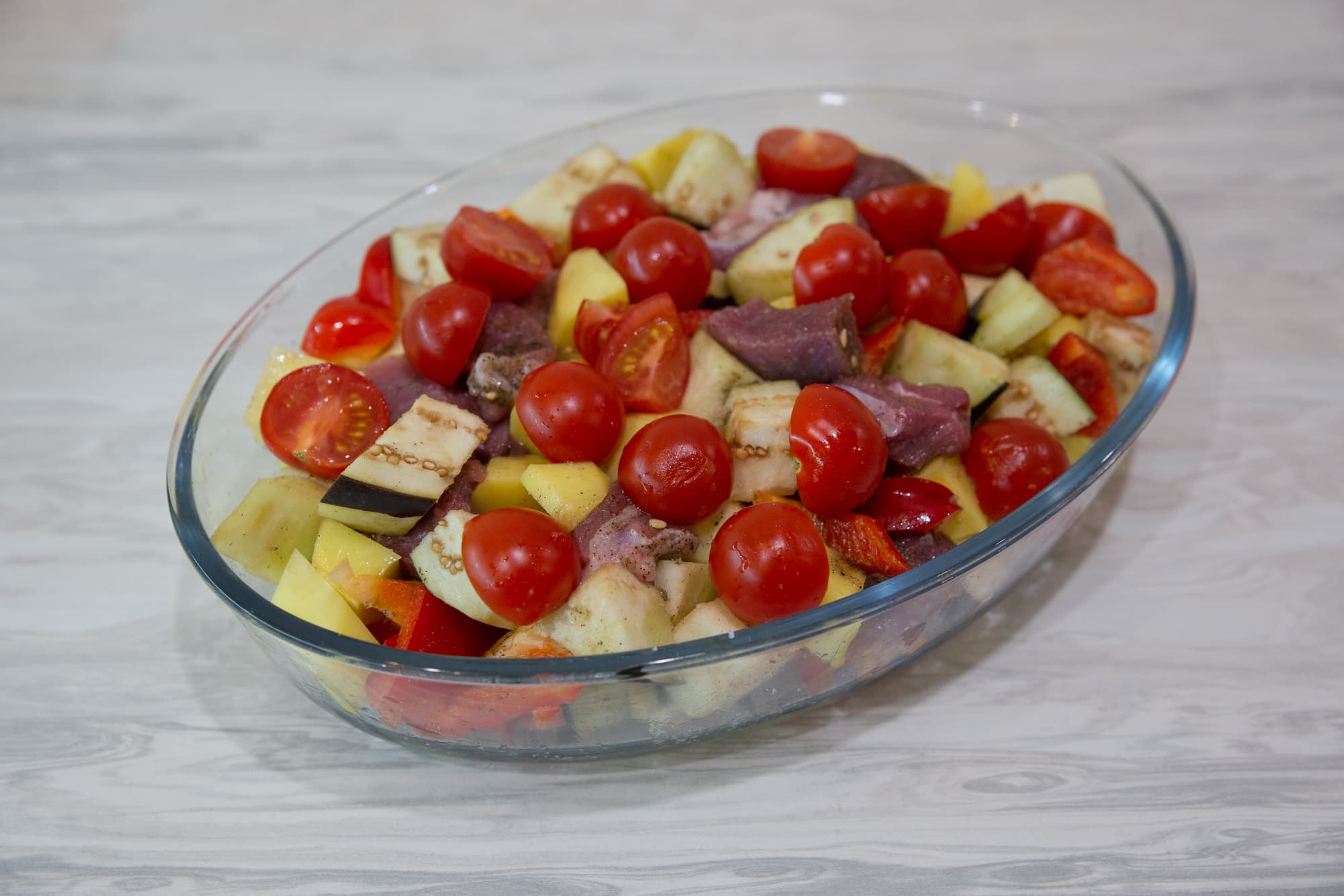 В большую стеклянную форму сложили нарезанные на небольшие кусочки баклажаны, картофель, филе бедра индейки и болгарский перец. Посолили, поперчили, добавили растительного масла и тщательно перемешали. Сверху выложили разрезанные помидоры черри.