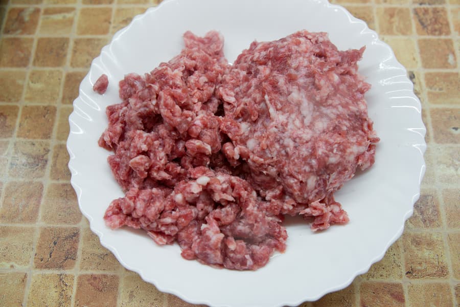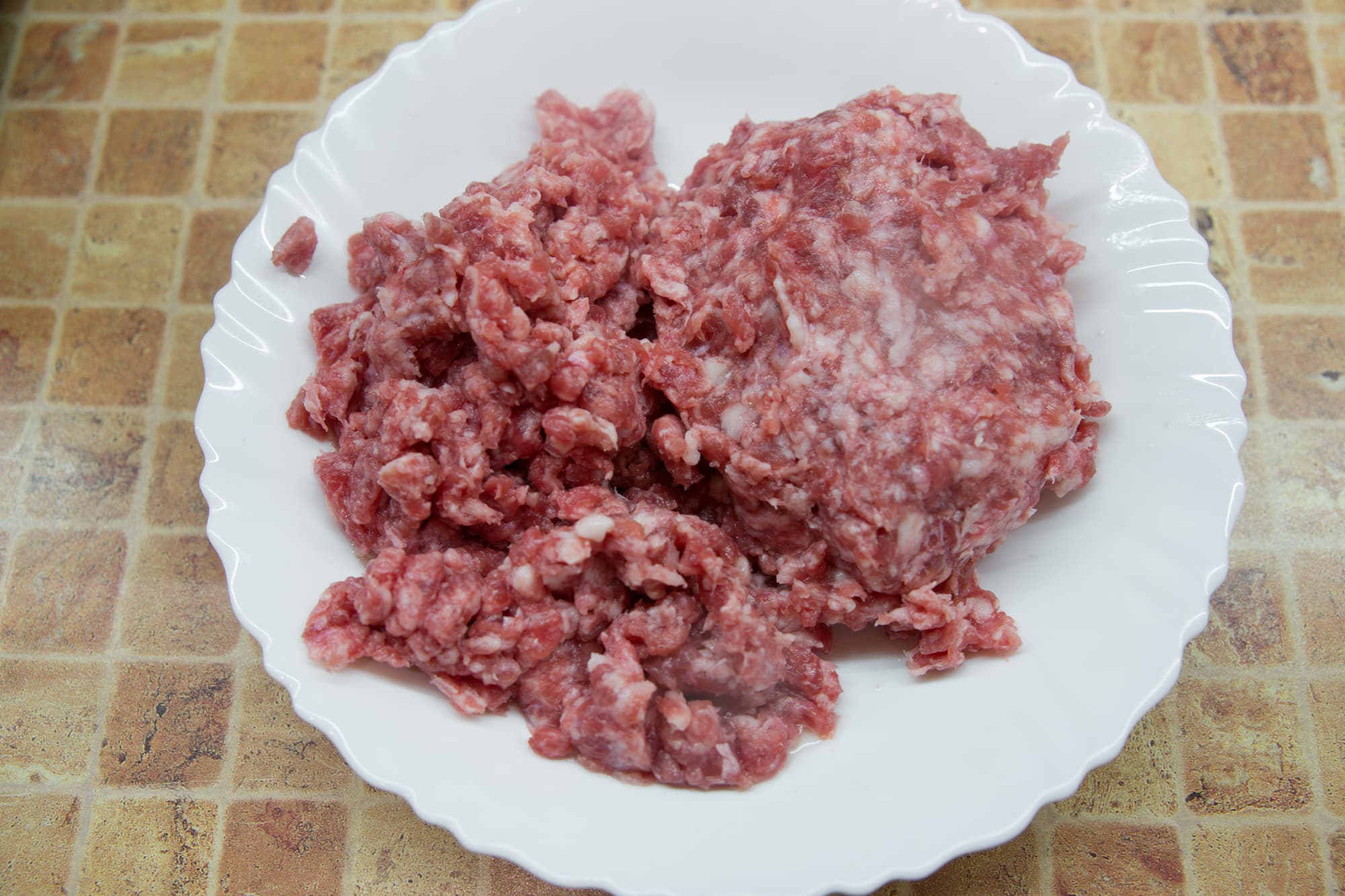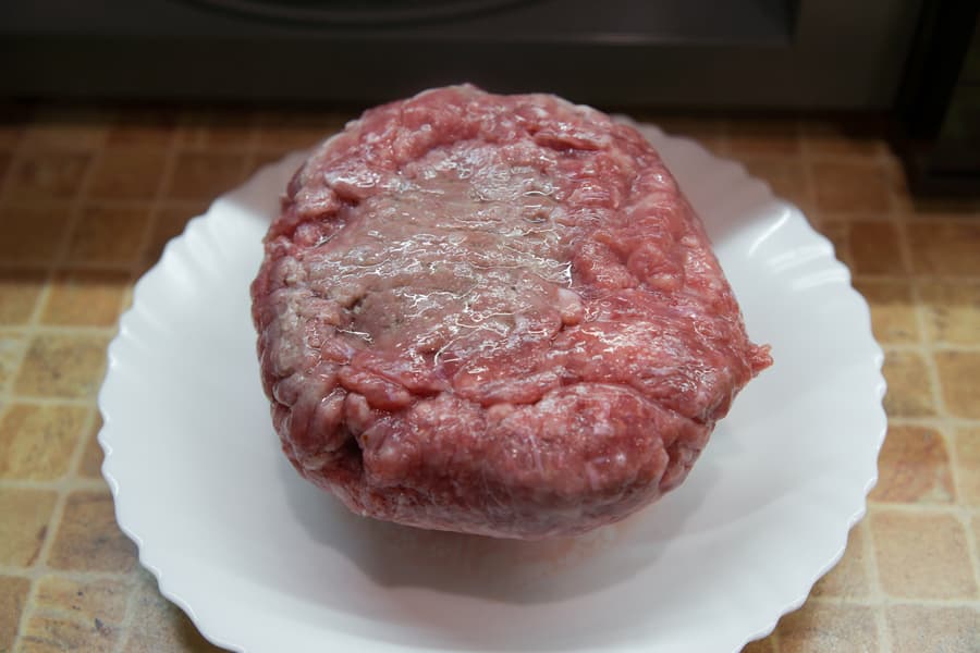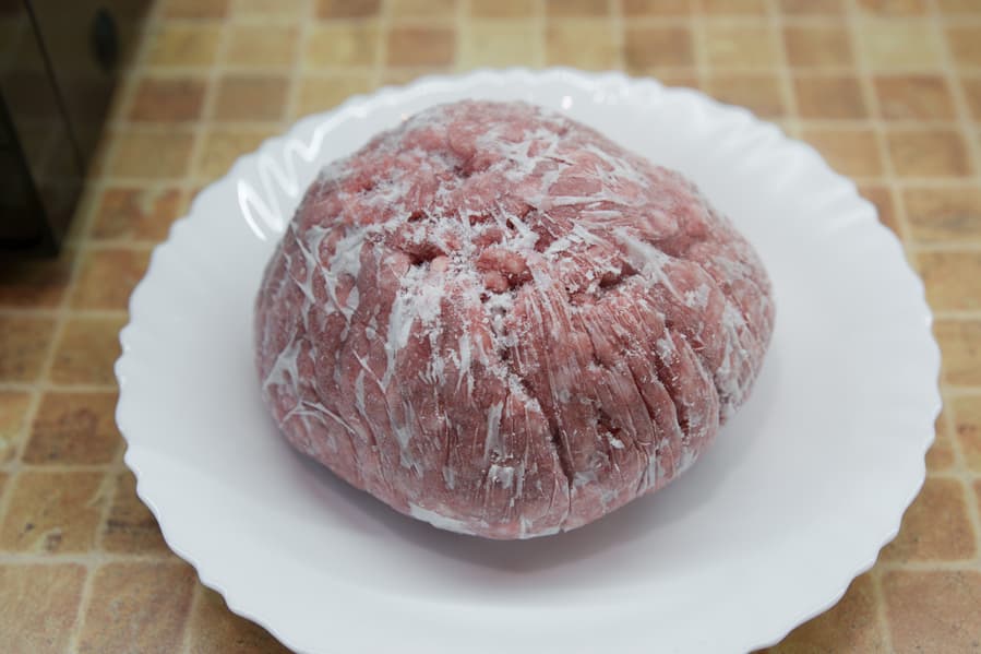 Традиционно начинаем с разморозки. 800 г свино-говяжьего фарша пролежали в морозилке некоторое время, превратились в камень, после чего попали в камеру микроволновой печи в режиме Турборазморозки по весу.