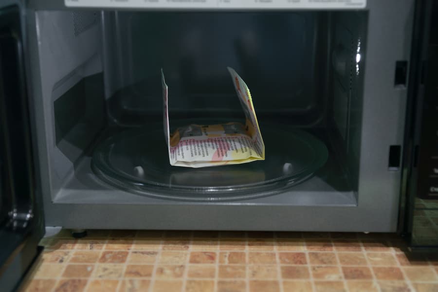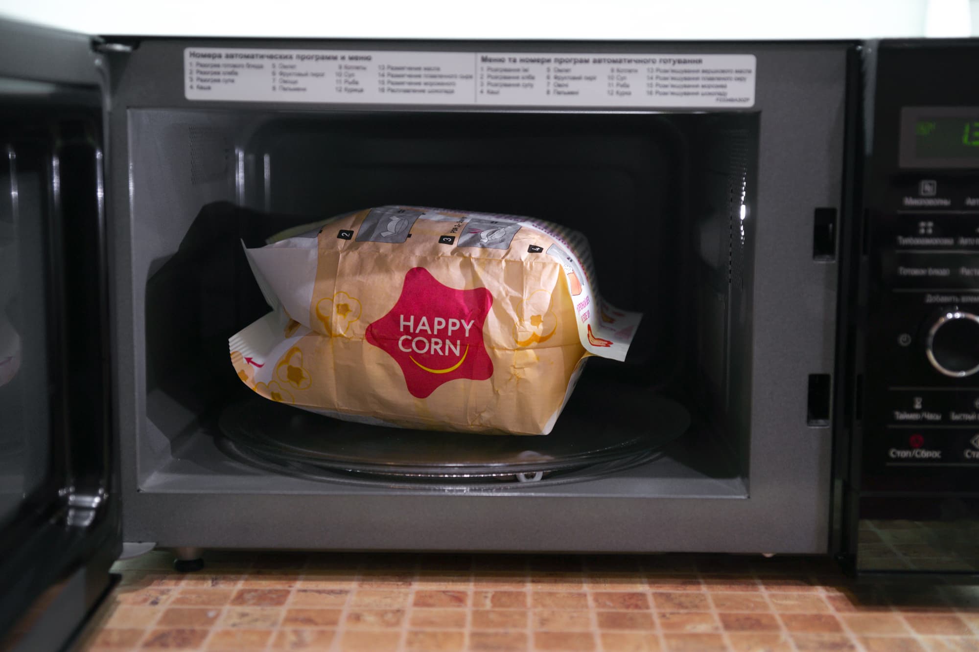 Пакет раздулся, скоро стали раздаваться частые хлопки и уже к середине второй минуты наступила тишина. Мы не ожидали такой скорости, засомневались, что взорваны все зерна, на всякий случай продержали микроволновку работающей еще около 10 секунд и наконец выключили.