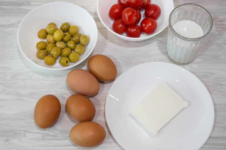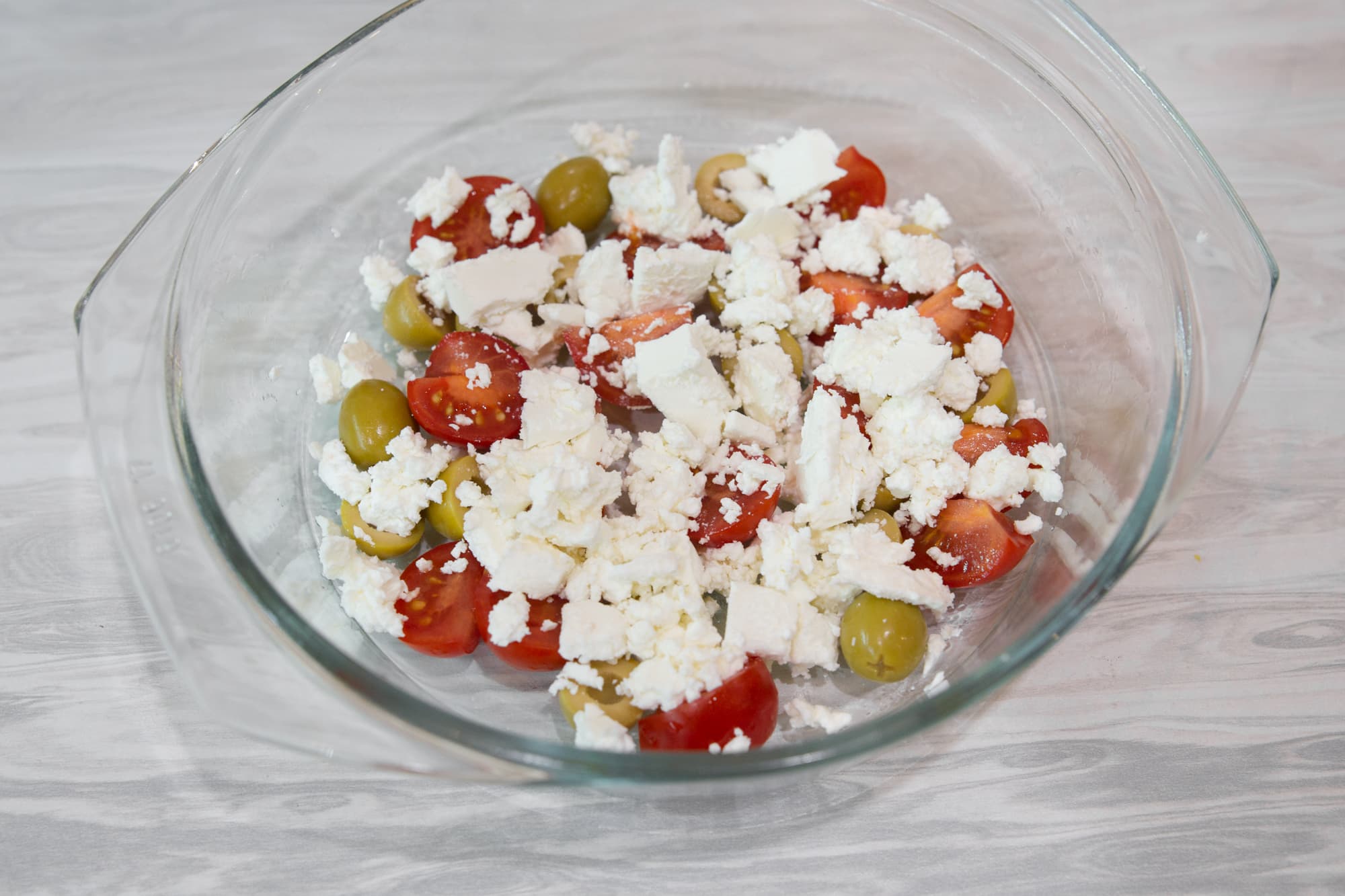 На дно смазанной растительным маслом формы выложили оливки и помидоры. Сверху распределили размятую вилкой брынзу.