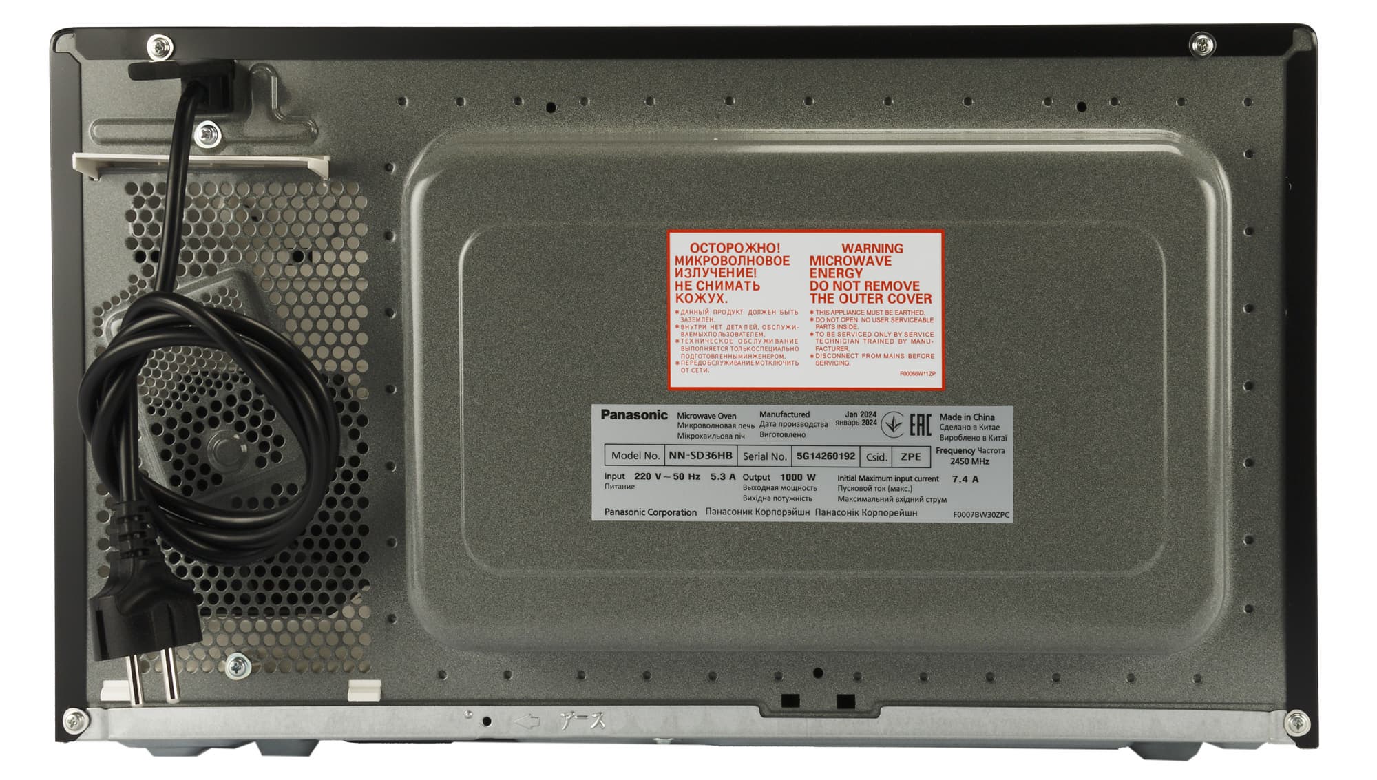 Черный корпус Panasonic NN-SD36HB смотрится строго и стильно. Верх и боковые стенки с выштамповкой выполнены из матового металла. По краям фасада пластиковая часть корпуса слегка выступает, образуя едва заметную рамку.