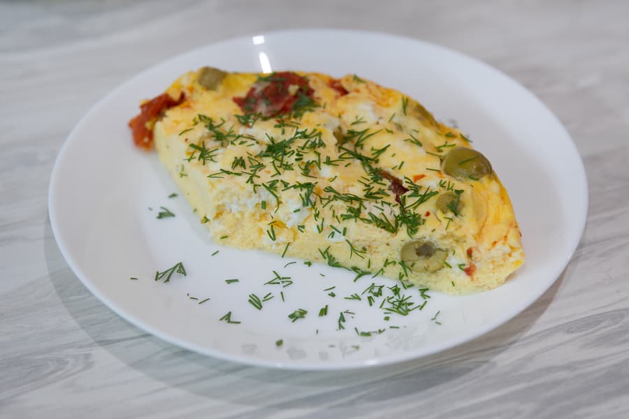 Добавили время и скоро получили полностью пропеченный, нежный и не пересушенный омлет. Итого печь справилась за 6,5 минут.