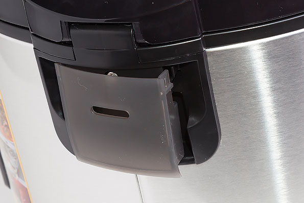 Для переноски используется ручка, расположенная на крышке мультиварки. Внутренняя крышка у устройства несъемная, а разборный паровой клапан крепится на резиновом уплотнении, и с легкостью снимается и устанавливается обратно. Контейнер для сборки конденсата, расположенный на боковой стенке, также с легкостью снимается и устанавливается обратно.