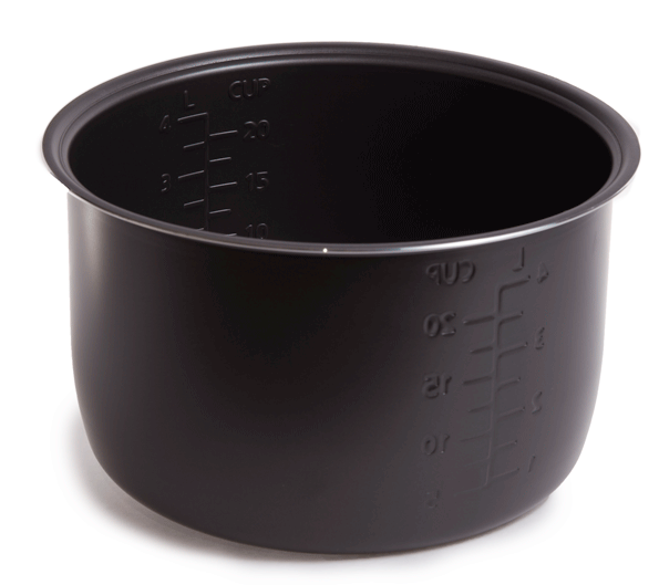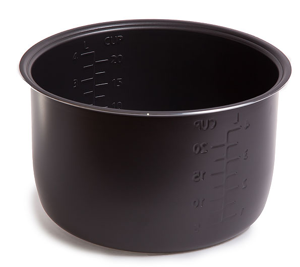 Мультиварка поставляется со стандартной чашей, защищенной антипригарным покрытием. Специальных ручек у чаши не предусмотрено, поэтому для ее извлечения потребуется воспользоваться жаропрочной прихваткой. Объем чаши, если считать верхнюю отметку по нанесенной шкале, составляет 3 литра, полный объем — 4 литра (правда, отметка эта находится почти у самого края).