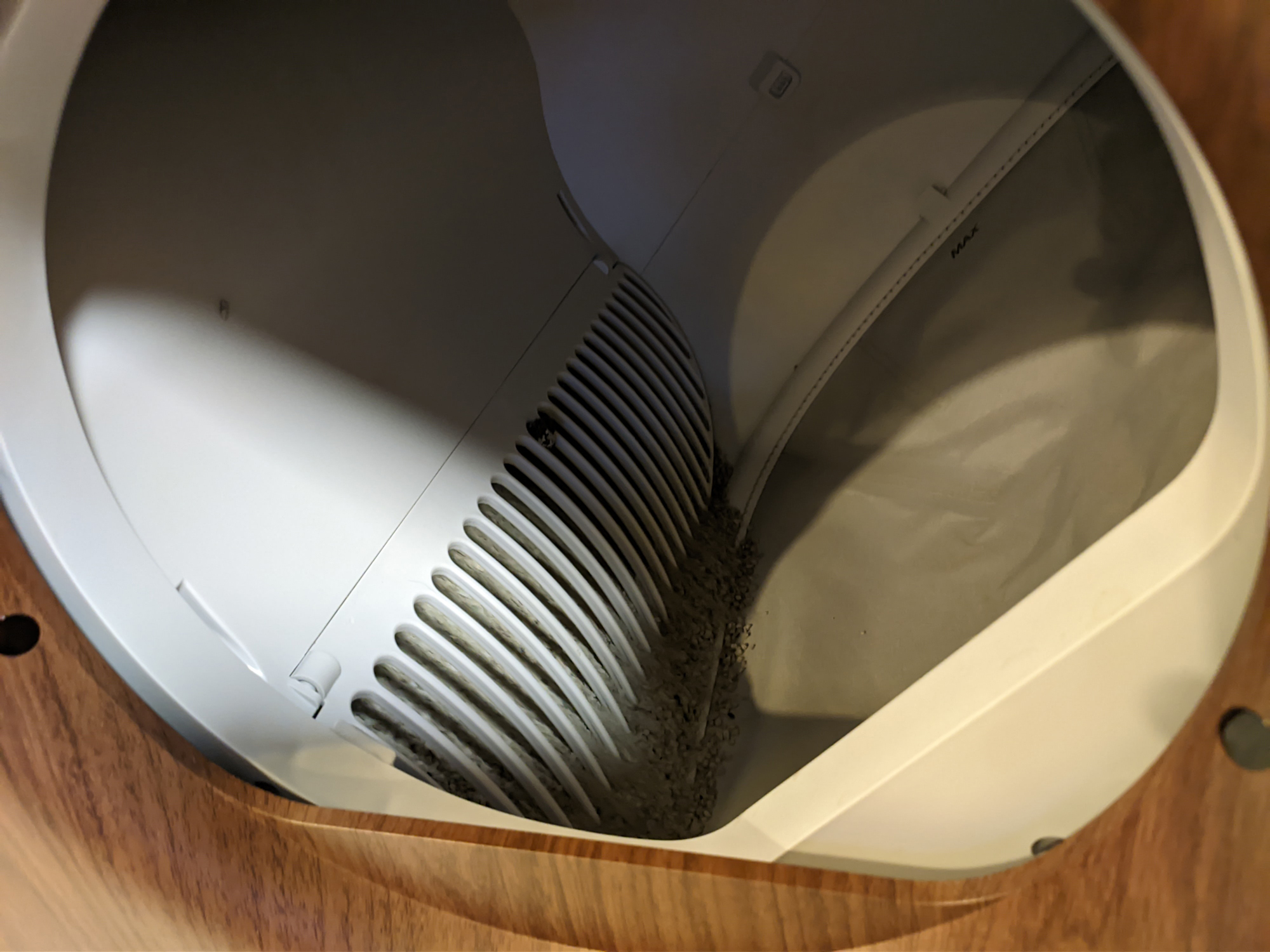 А вот так выглядит непосредственно процесс сброса комков в лоток для отходов. Окно для сброса довольно большое, поэтому можно не волноваться, что часть комков останется внутри барабана.