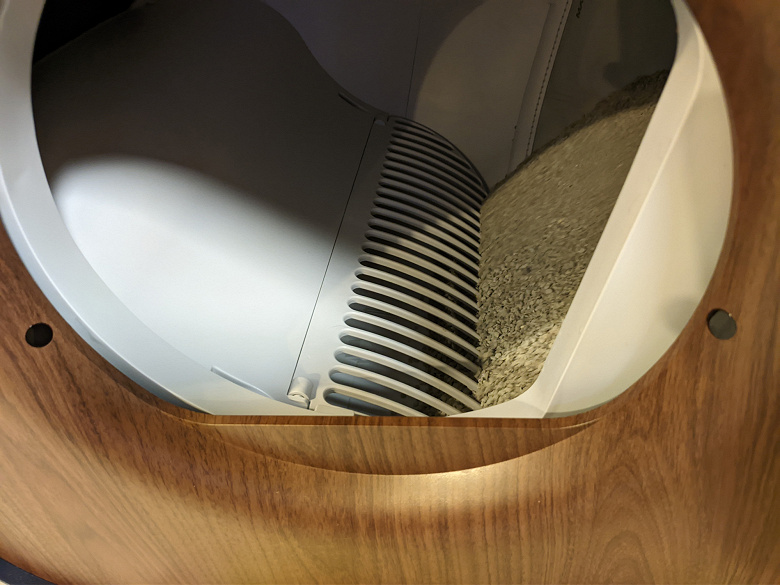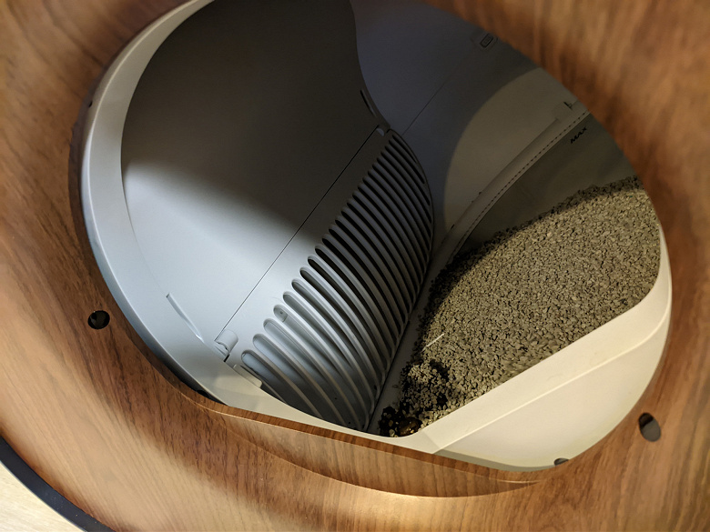 Под крышкой расположен отсек для кошачьего наполнителя, выполненный из серого пластика. Именно в нем будет происходить самое интересное. После того, как кошка сделает свое дело, отсек начнет вращаться, а наполнитель будет профильтрован через специальные прорези. В результате отработанный наполнитель попадет в лоток для мусора, а сухой — останется внутри отсека.