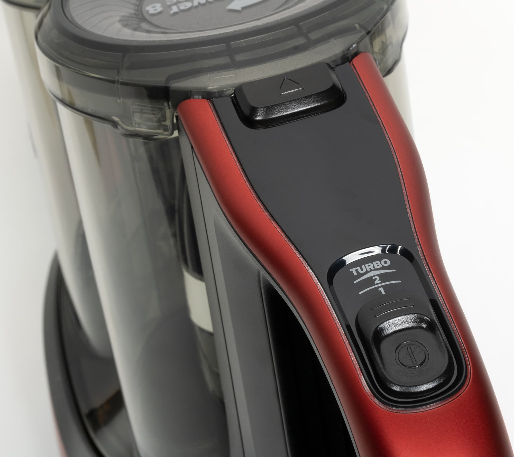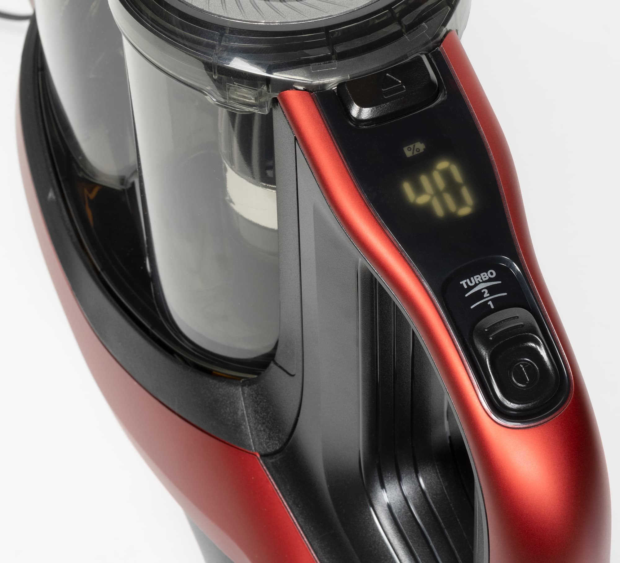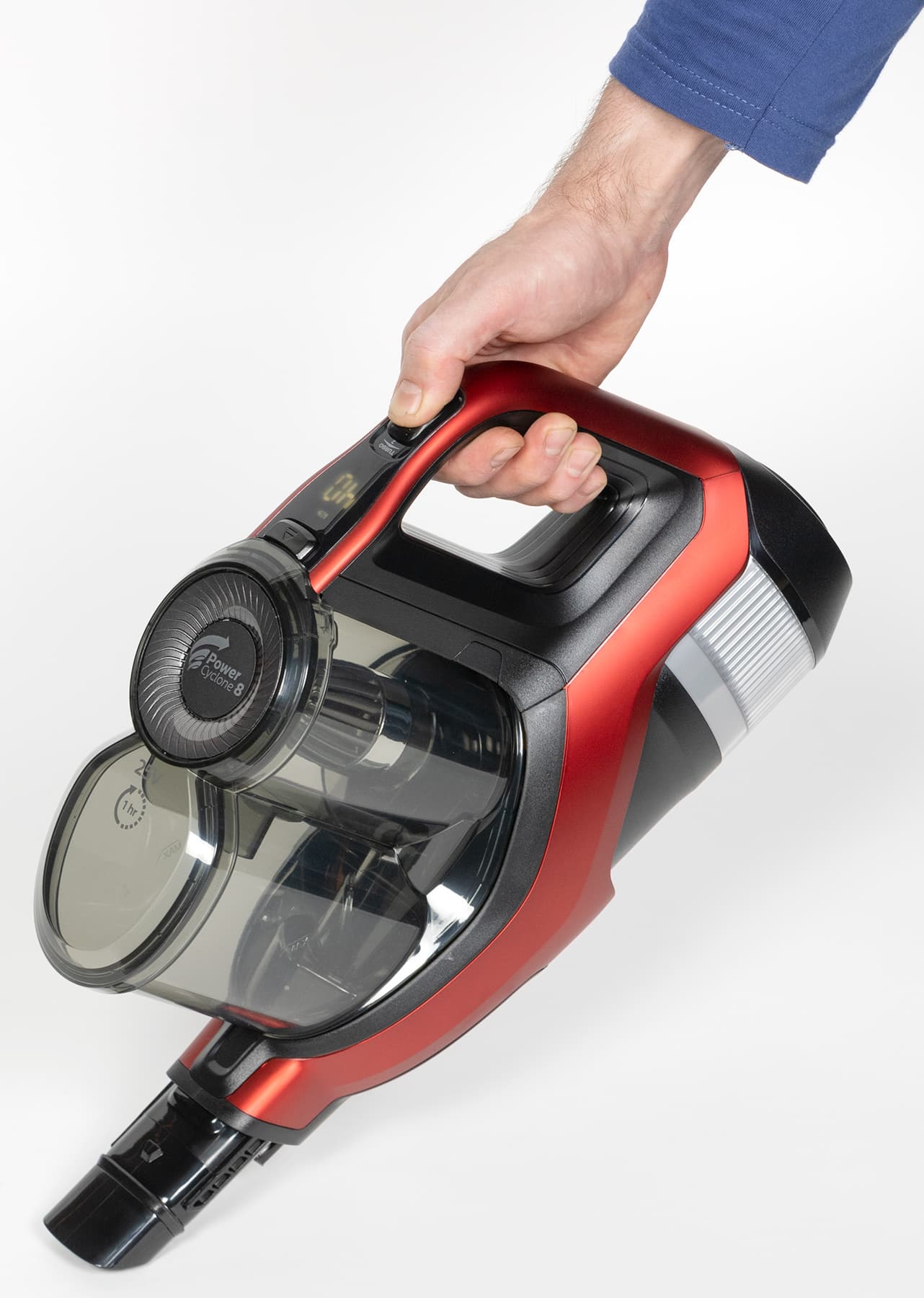 На ручке пылесоса расположен четырехпозиционный переключатель, управляющий мощностью всасывания. Он рассчитан на управление большим пальцем любой руки: пользоваться Philips 7000 SpeedPro Max удобно как правшам, так и левшам. Над переключателем находится дисплей, отображающий уровень заряда аккумулятора (у выключенного прибора он не виден, и мы рассмотрим его чуть ниже), а еще выше — защелка, удерживающая контейнер для мусора.