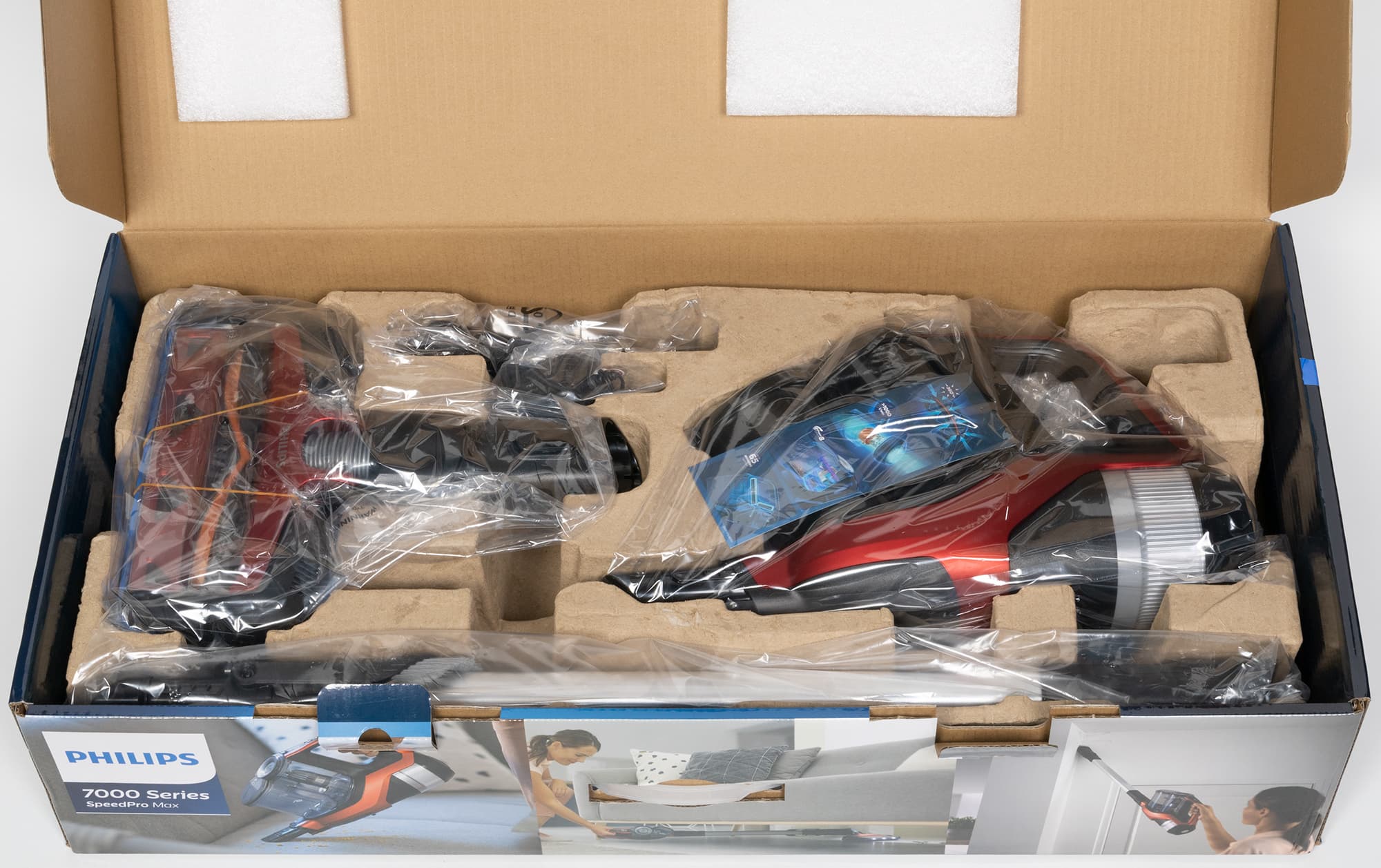 Пылесос и аксессуары закреплены в упаковке с помощью трехмерных конструкций из папье-маше и упакованы в прозрачный полиэтилен.