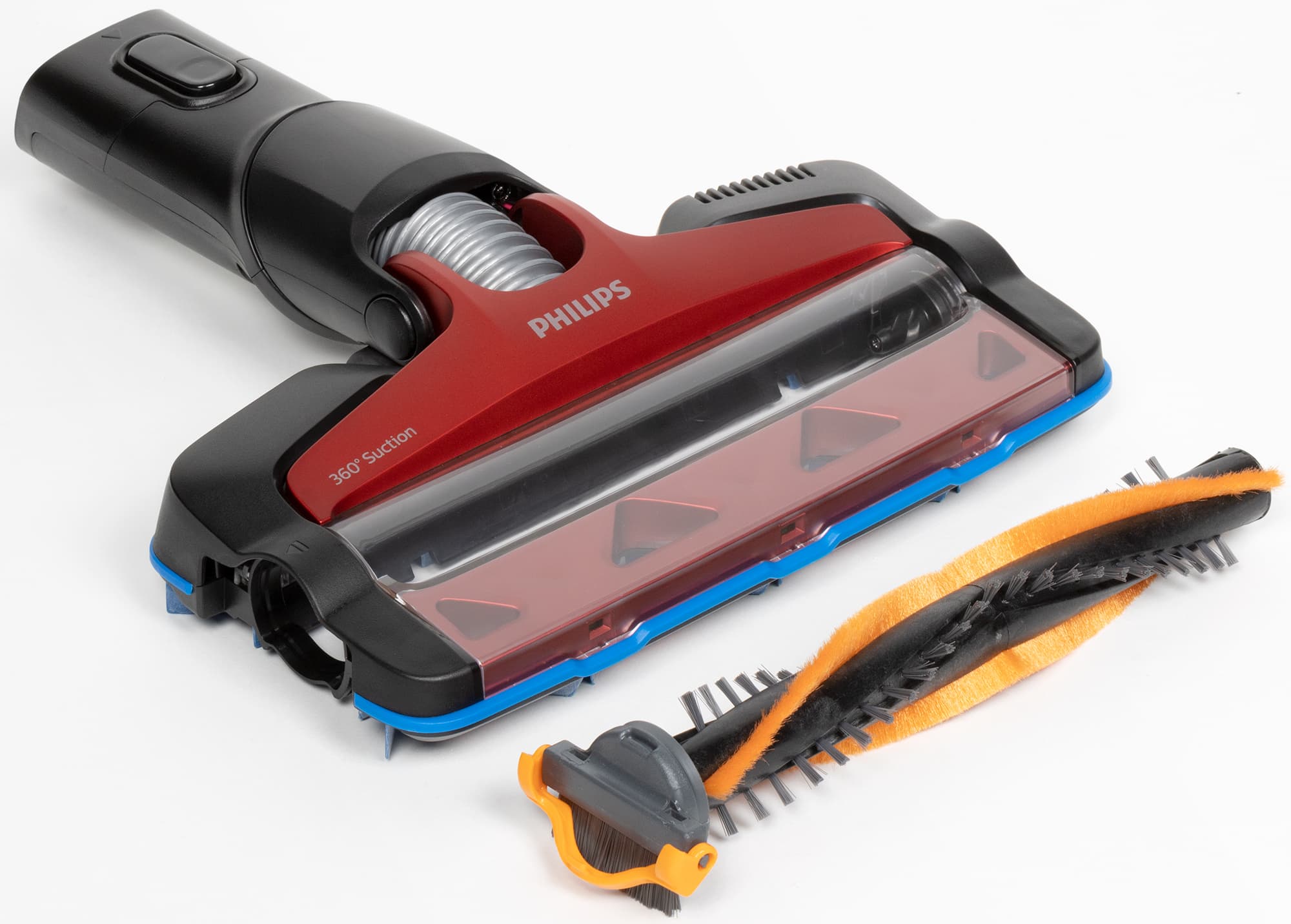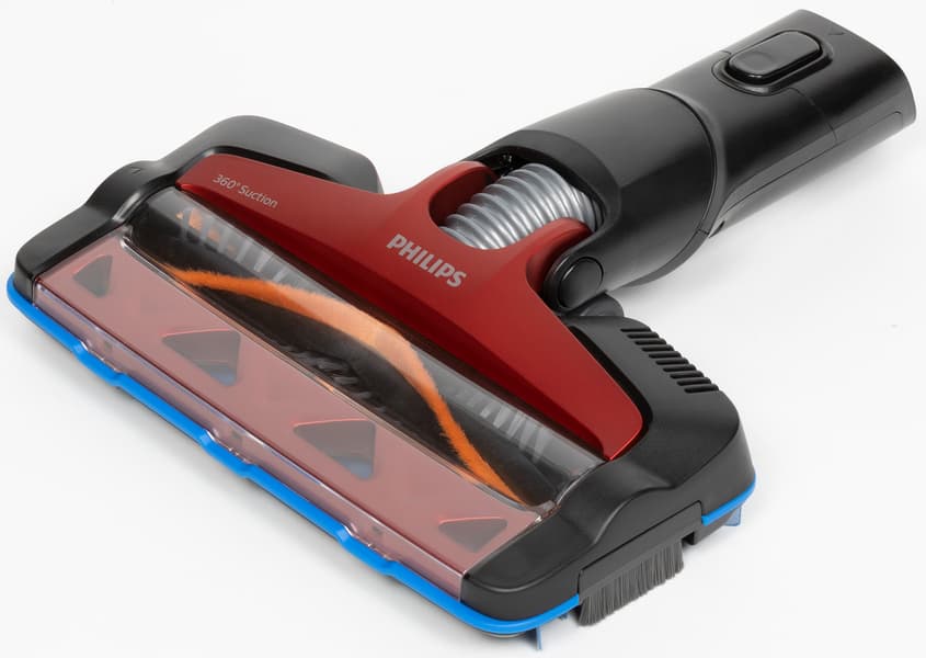 Шарнир моторной насадки для пола позволяет ей легко изгибаться вперед-назад на 90°, а вправо-влево — примерно на 80°. Парковочного положения у нее нет.