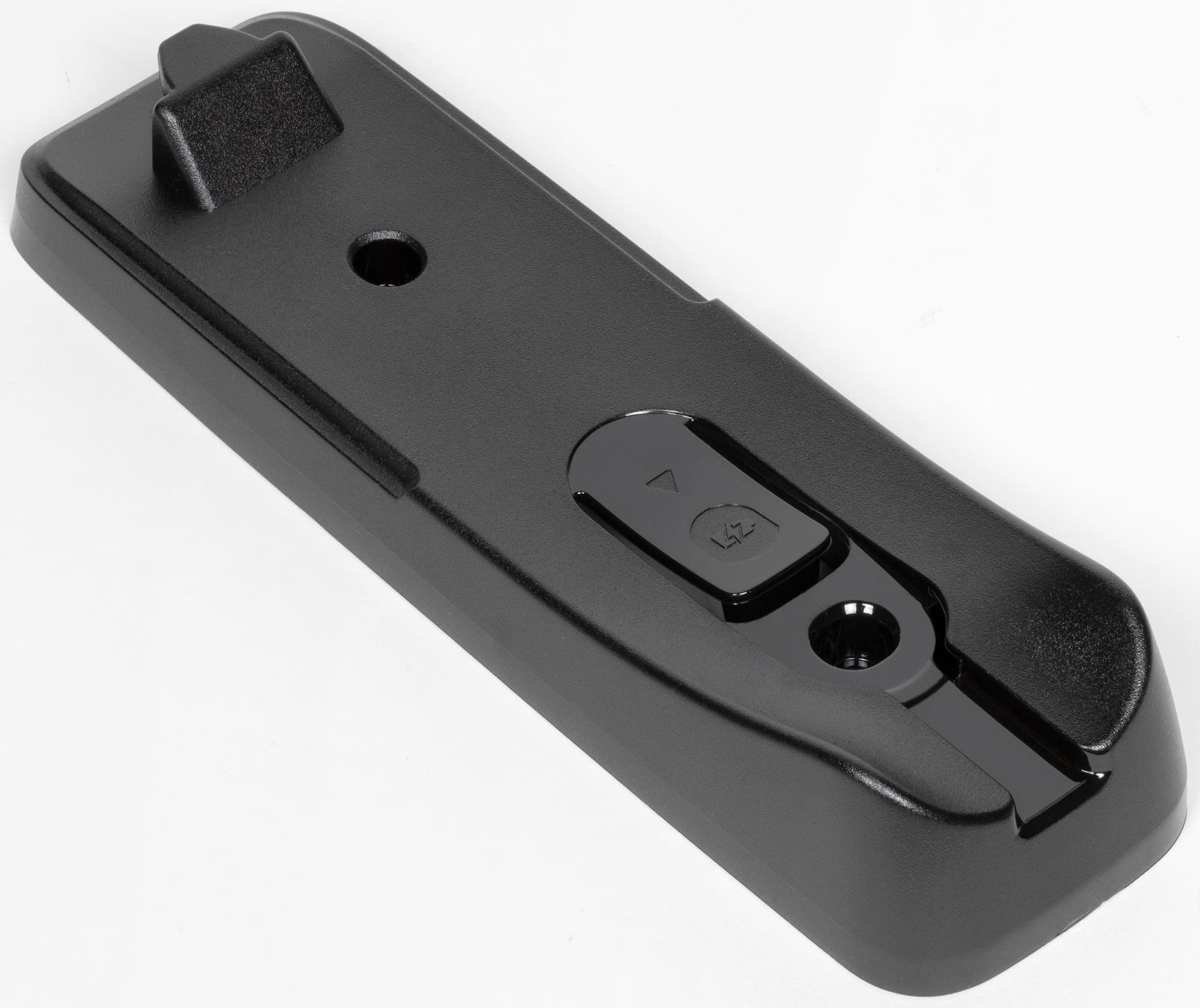 На корпусе крепления — два отверстия для монтажа, выступ для подвешивания пылесоса и гнездо для размещения контактной площадки.