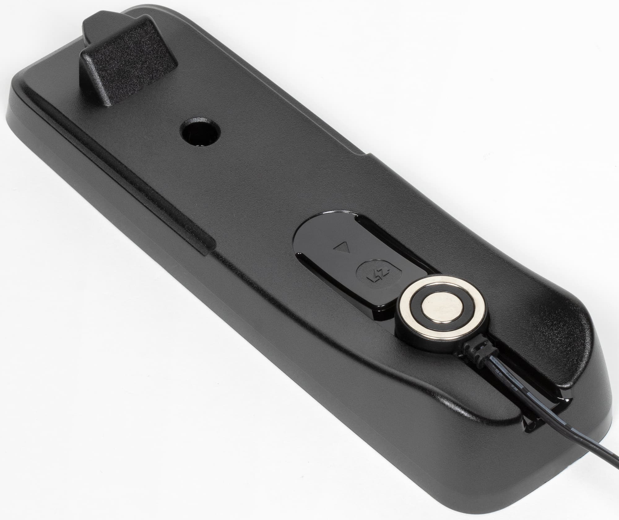 На нижней панели есть магнитная площадка для подключения зарядного устройства и специальный паз для подвешивания в настенном креплении.