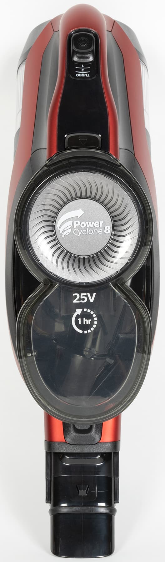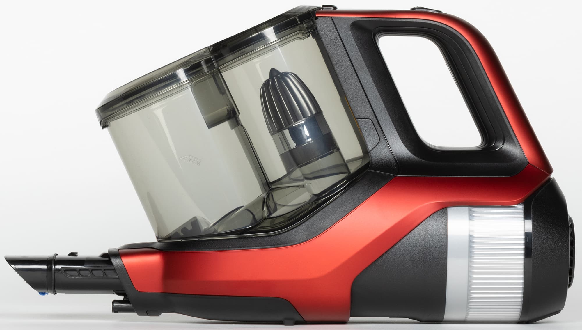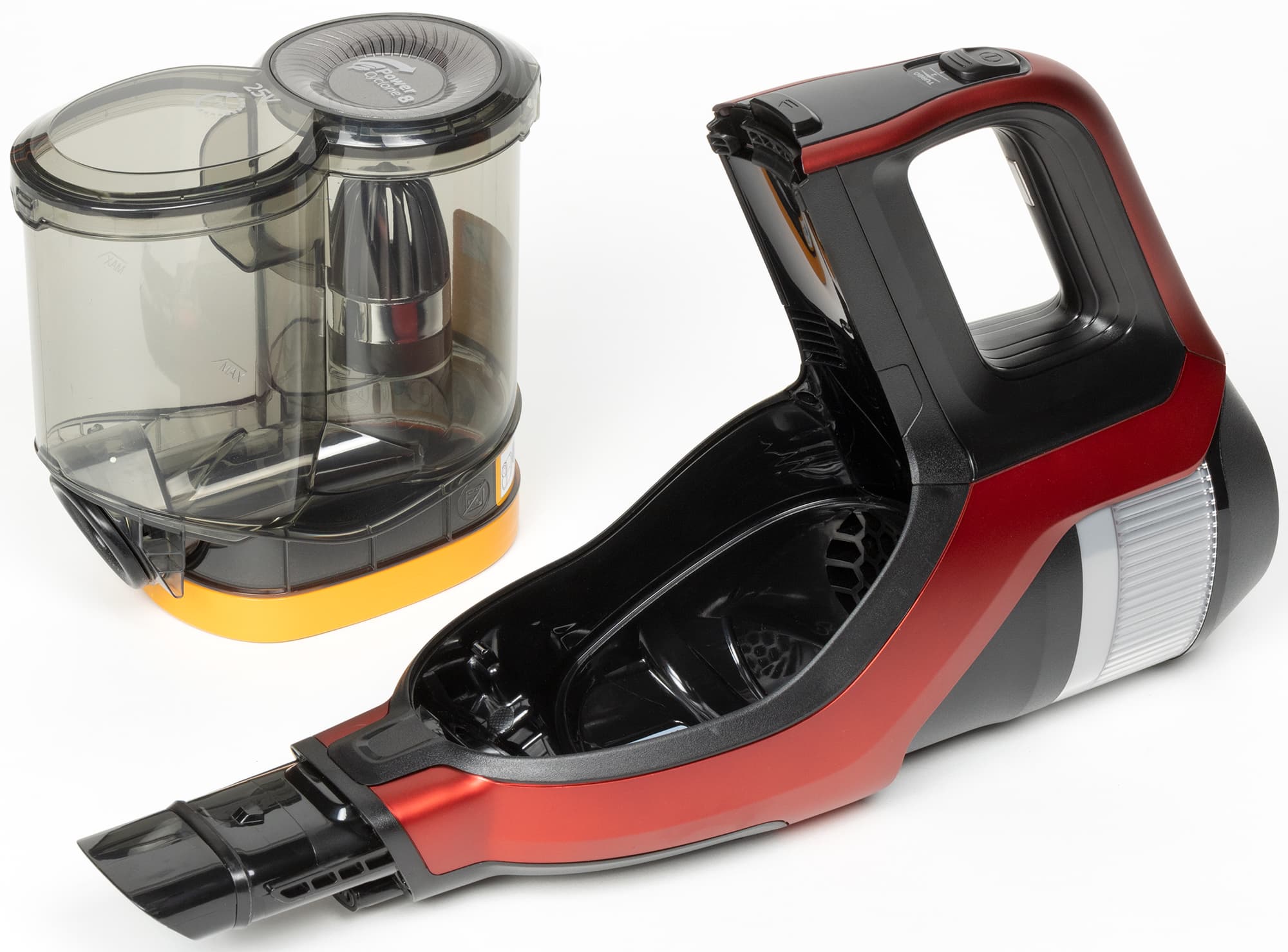 Циклонный фильтр расположен под углом приблизительно в 60° относительно оси прибора. Оба цилиндрических отсека закрыты общей крышкой, через которую удобно вытряхивать контейнер.