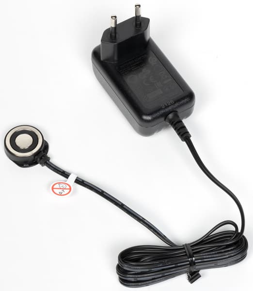 Провод адаптера переменного тока заканчивается круглой площадкой, примагничивающейся к контактам моторного блока. Конструкция допускает непосредственное подключение к пылесосу, но удобнее совместить питание с настенным креплением.