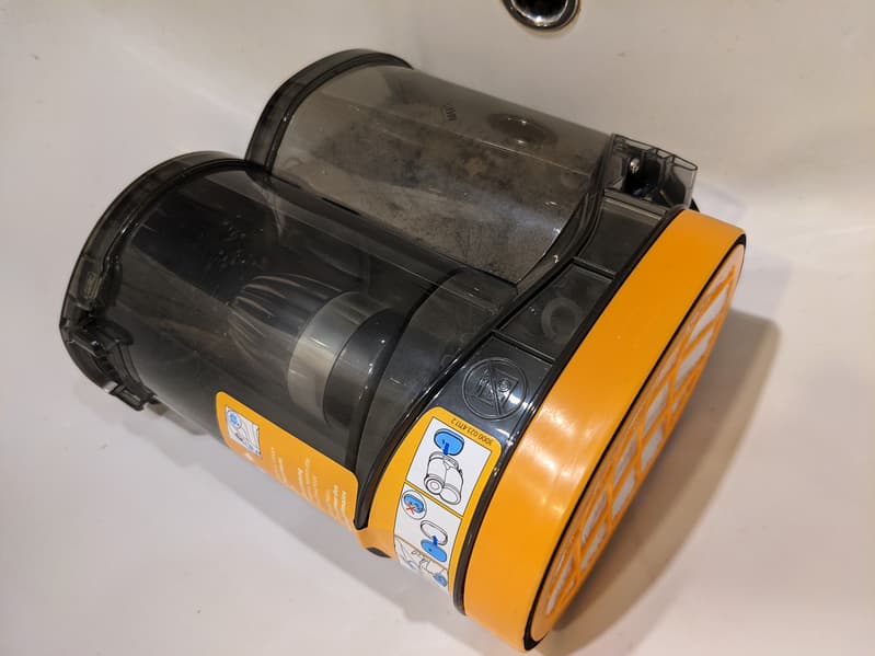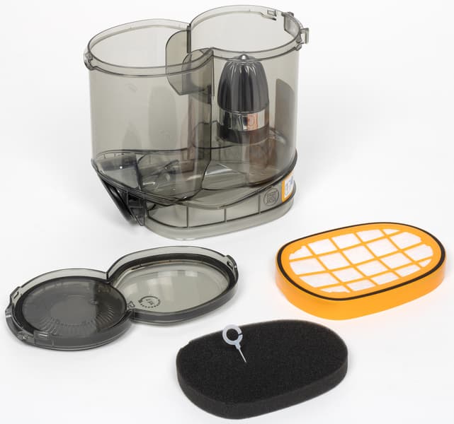 Контейнер вместе с фильтрами легко отделяется от моторного блока, а его конструкция позволяет донести его до мусорного ведра, не просыпав содержимое.