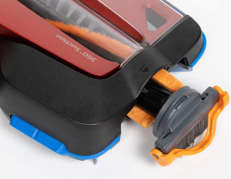 Роторная щетка снабжена двумя рядами редкой жесткой щетины черного цвета и двумя сплошными полосами более мягкой оранжевой. Она извлекается вместе с одной из боковых с торца корпуса.