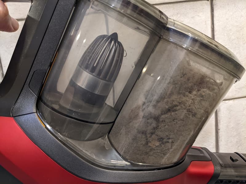 У контейнера для мусора любопытная нестандартная конструкция. В отличие от большинства моделей пылесосов, циклонный фильтр и пылесборник у Philips 7000 SpeedPro Max разделены: поток воздуха попадает в циклон снизу вверх, закручивается вокруг центрального элемента и поднимается дальше.