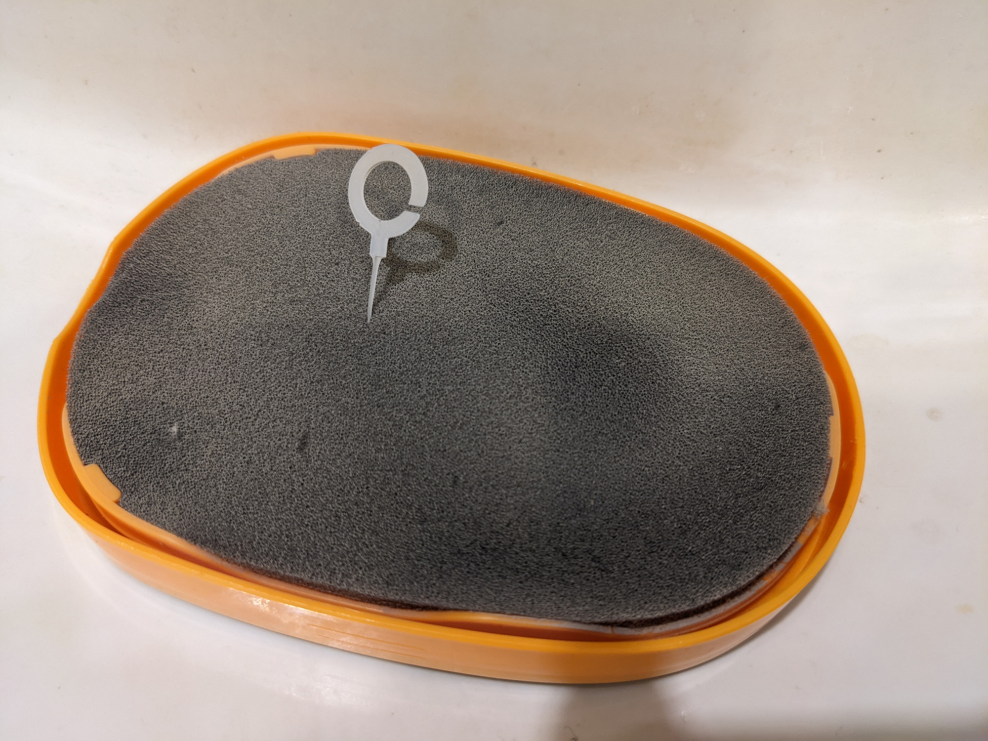 Роль предварительного фильтра выполняет толстый, около 20 миллиметров толщиной, слой поролона. Для удобства извлечения к нему приделали пластиковое колечко.