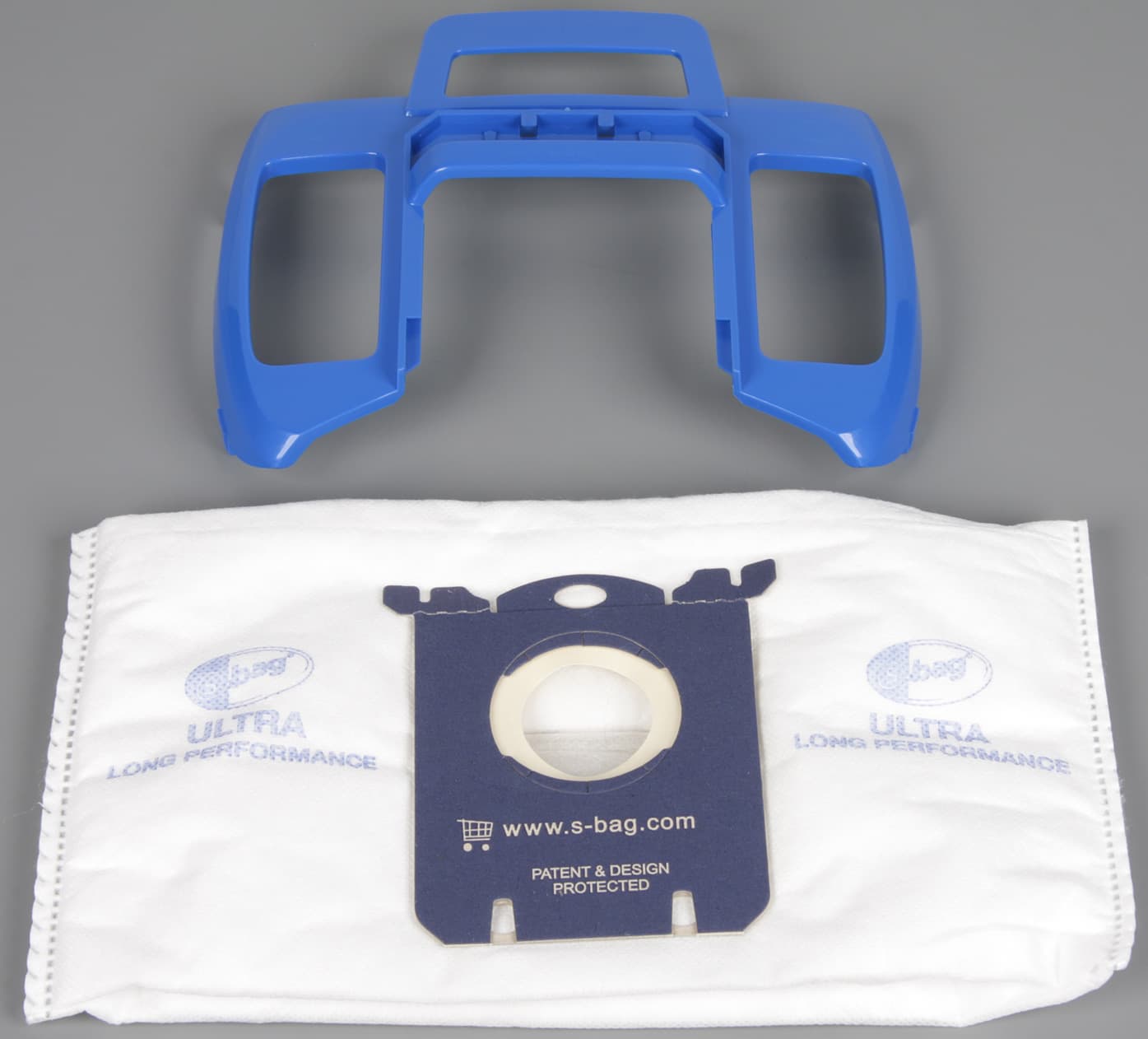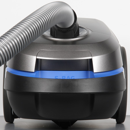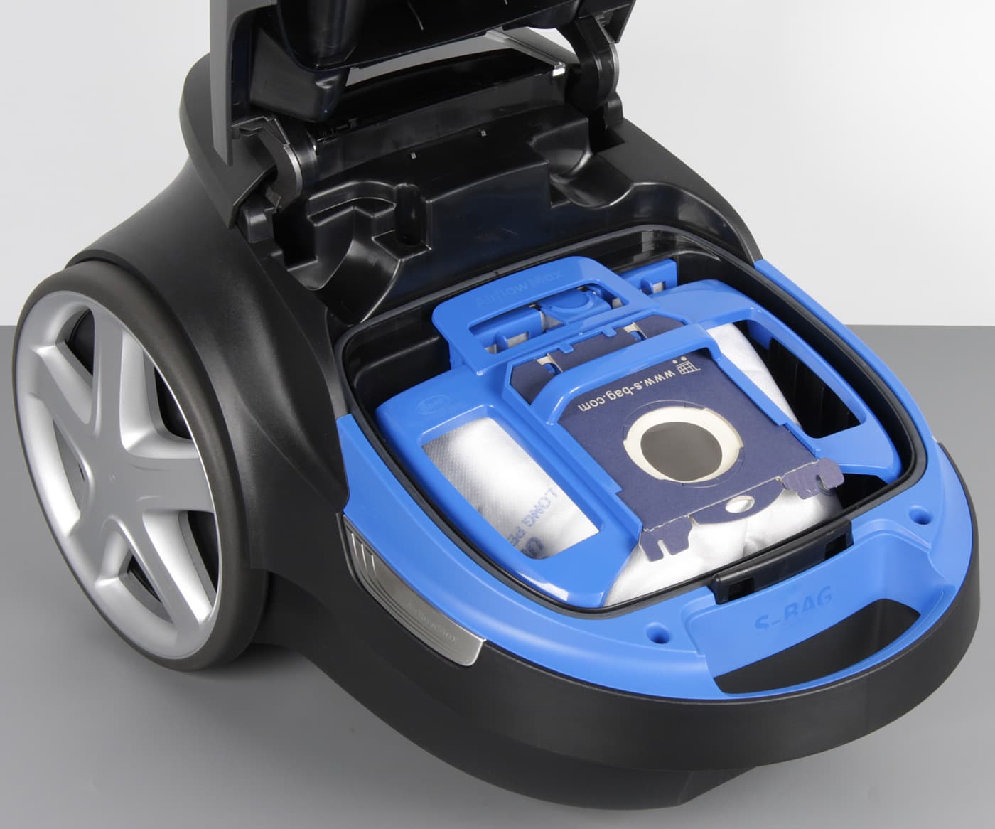 Отсоединяя мешок от рамки, нужно потянуть за язычок спереди, тогда картонная шторка перекроет входное отверстие мешка, и у пыли не будет шансов попасть в воздух. Это особенно оценят те пользователи, которые склонны к аллергической реакции на пыль. В отсеке для мешка можно увидеть специальные ребра, которые направляют потоки воздуха и не дают мешку соприкасаться со стенками. Решетка предмоторного фильтра также имеет ребра, выполняющие аналогичные функции. В итоге воздух фильтруется через большую площадь поверхности мешка, а мешок заполняется равномерно. Также производитель заявляет, что в мешке используется высококачественный волокнистый материал, благодаря которому поры мешка не забиваются пылью, и мощность всасывания не уменьшается. Предмоторный фильтр склеен из трех слоев: два слоя тонкого волокнистого материала между которыми находится слой поролона.