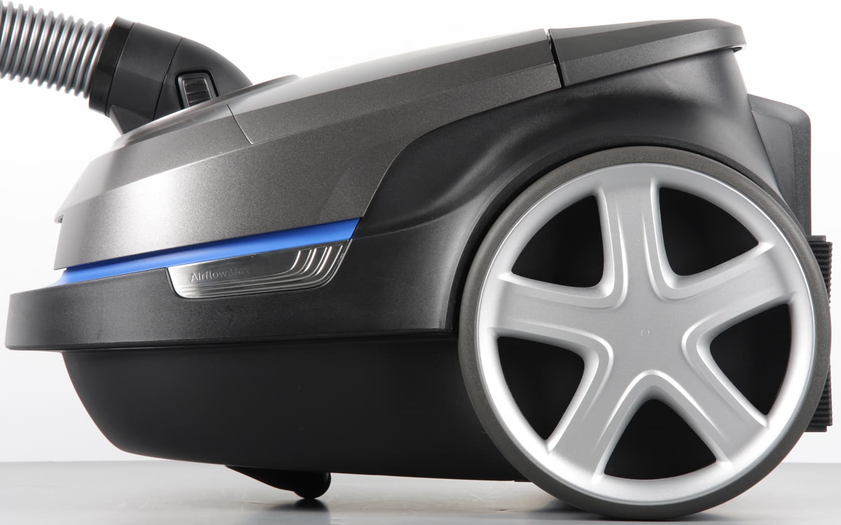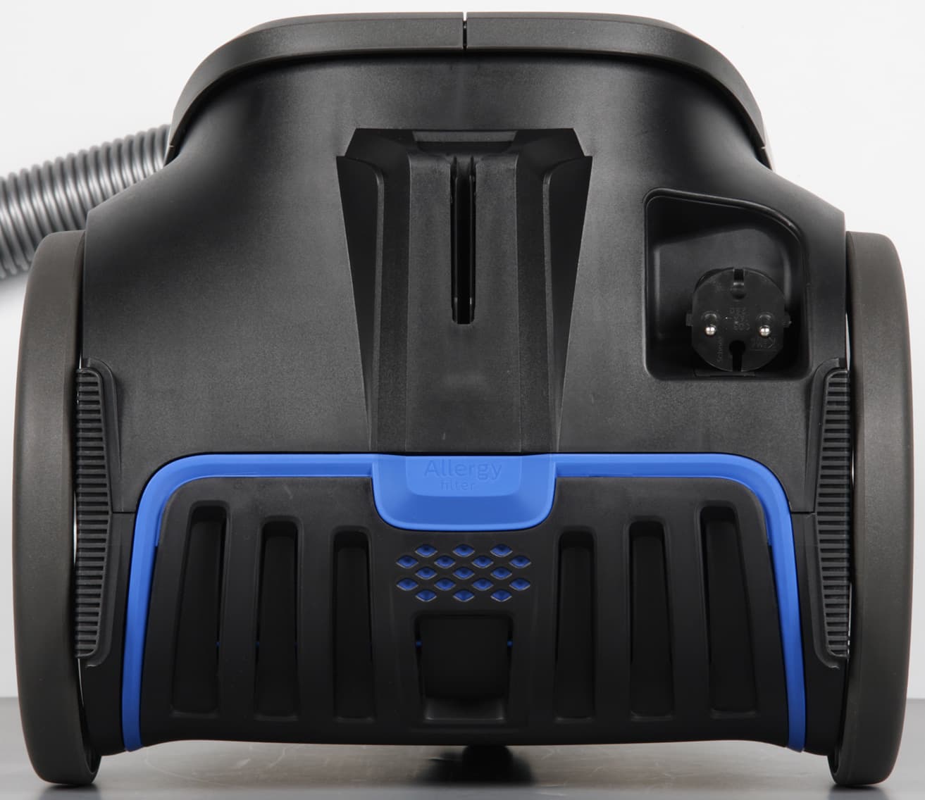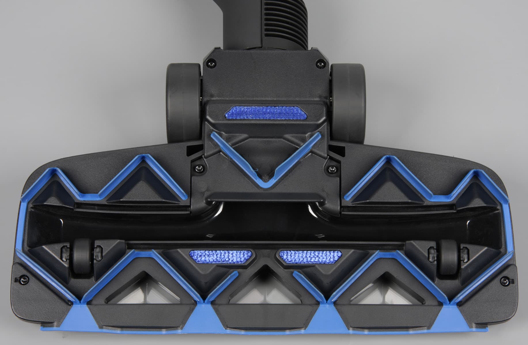 Дизайн практичный, но не без ряда элементов, несущих декоративные функции. Корпус пылесоса и аксессуары изготовлены в основном из черного пластика с матовой поверхностью и без покрытия. На таком материале загрязнения и мелкие повреждения в глаза не бросаются. Верхняя часть моторного блока имеет темно-серо-серебристое покрытие, внутренняя часть передней ручки-скобы из ярко-синего пластика, по бокам есть вставки из нержавеющей стали, а обода колес имеют серебристое покрытие.