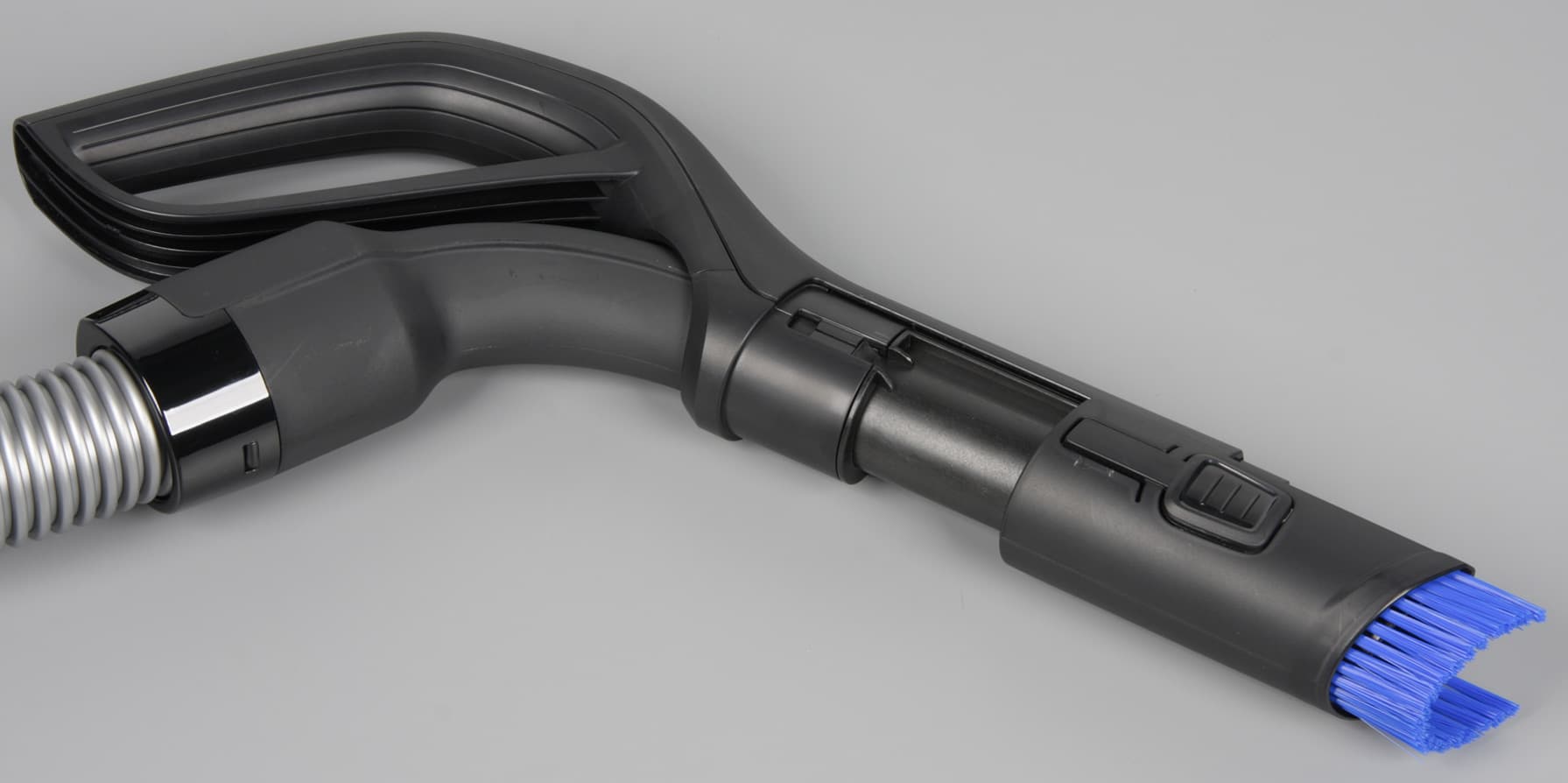 Труба к основной щетке и труба к ручке стыкуются только в определенной ориентации и фиксируются подпружиненными сдвижными муфтами. Конец гибкого шланга к входному отверстию пылесоса также стыкуются только в определенной ориентации и фиксируется пластиковыми защелками. Шланг свободно проворачивается только в патрубке на рукоятке.