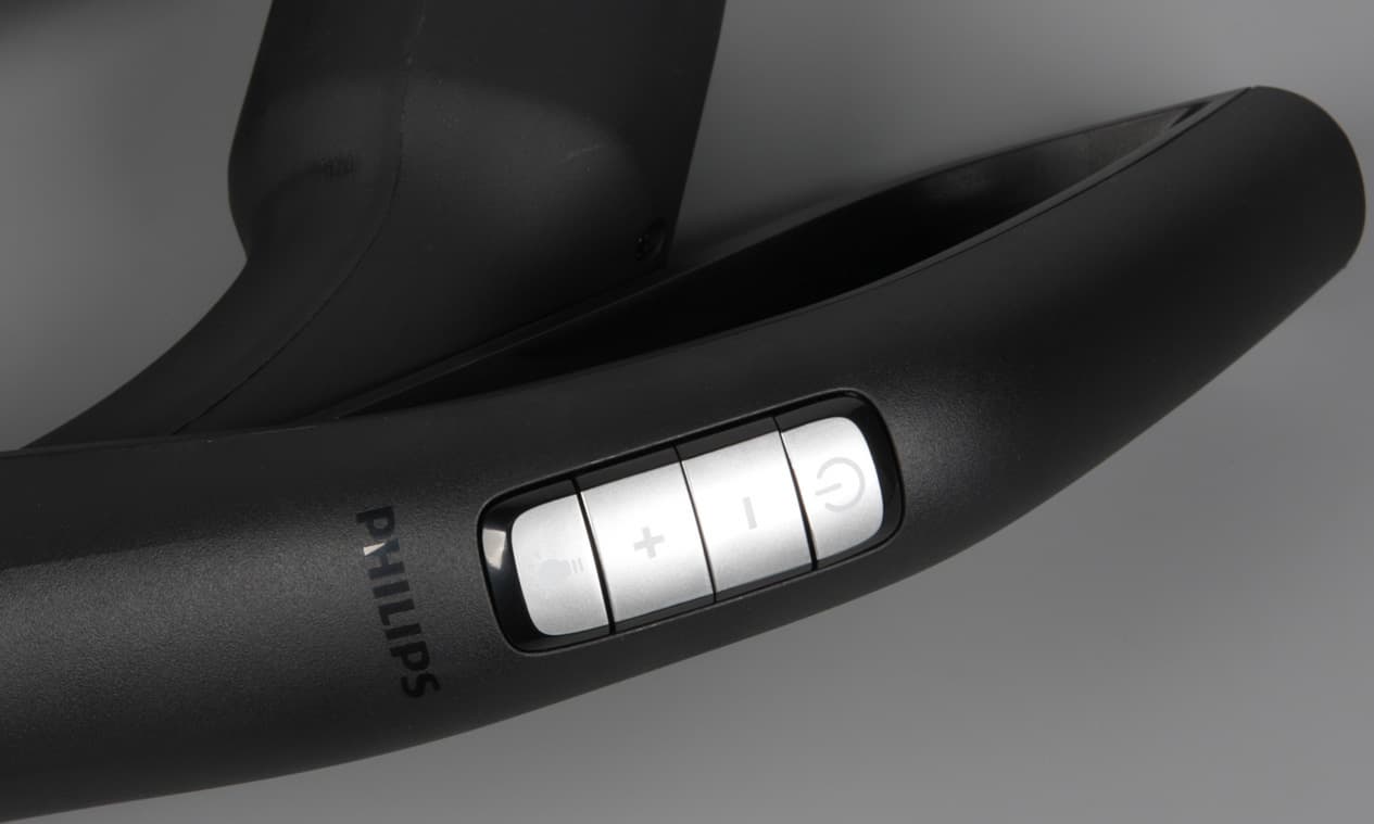 Мощность регулируется кнопками «плюс» и «минус» на рукоятке. Также отдельными кнопками на рукоятке включается и выключается подсветка на насадке TriActive LED и мотор пылесоса.