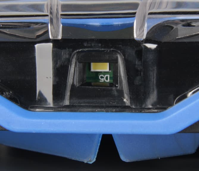 Окантовка из прозрачного пластика вокруг входного отверстия и между педалями и окошком с индикаторами ровно подсвечивается голубым во время работы пылесоса, плавно мигает голубым в отключенном по бездействию состоянии и не горит, когда пылесос выключен.