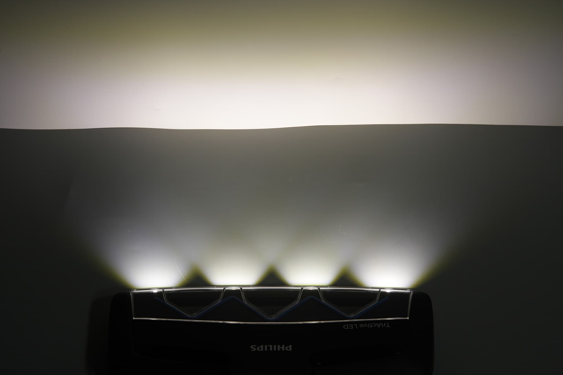 В целом пылесос нам показался удобным в использовании. Относительно большие габариты и вес предполагают, что бо́льшую часть времени пылесос будет на полу, а не в руках пользователя. Переносить пылесос приходится за переднюю ручку, ручка сверху была бы удобнее. Впрочем, носить пылесос в руках приходится нечасто, так как его можно просто тянуть за собой за шланг, при этом достаточно легко преодолеваются даже относительно высокие пороги. За шланг из-за угла пылесос вытягивается с трудом, поскольку его передняя часть закруглена по большому радиусу. Маневренность слегка снижена из-за того, что шланг в месте подсоединения к моторному блоку не проворачивается. По этой же причине приходится дополнительно следить, чтобы во время уборки шланг не пережимался. Непреднамеренно перевернуть пылесос вверх колесами во время уборки практически невозможно. Основная насадка TriActive LED доказала свою высокую эффективность на гладких и ковровых покрытиях. К ковролину насадка присасывается с умеренной силой, но для перемещения ее по полу с таким покрытием приходится прилагать определенные усилия. С этой насадкой удобно подлезать под предметы обстановки с невысоким просветом от пола. Контролировать тщательность уборки в таких местах помогает яркая светодиодная подсветка, имеющая хороший охват освещения вперед в стороны и немного вверх. Подсветка направлена почти параллельно полу, поэтому позволяет лучше выявить загрязнения, плохо видимые при обычном освещении сверху. Так насадка освещает вертикальную белую стенку: