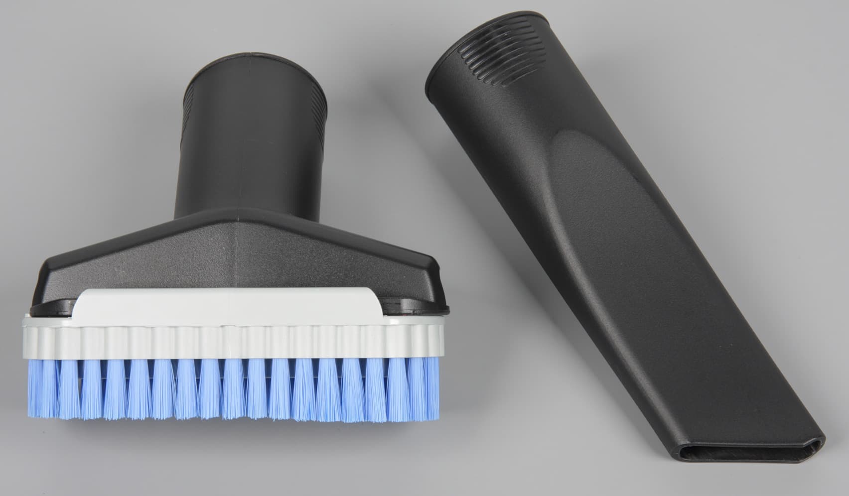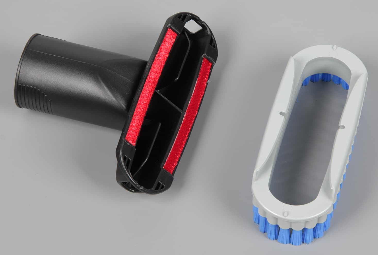 В самом пылесосе хранятся типичная щелевая насадка (относительно короткая) и насадка 2-в-1 со съемным щетинистым венцом.