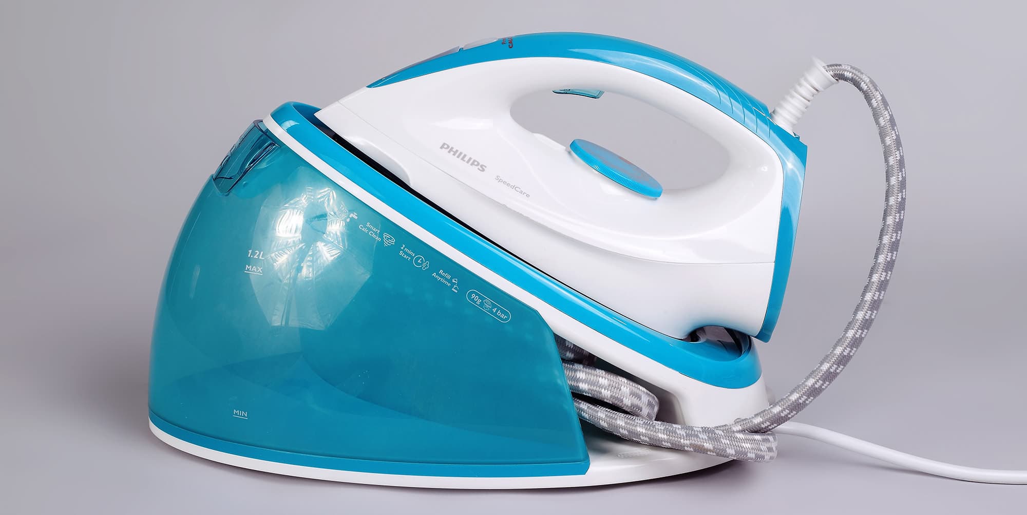Philips GC 6602/20 выглядит этакой глыбой, но при переноске оказывается довольно легким. Утюг стоит сверху на базе-контейнере и соединен с ней длинным плоским шлангом в текстильной обмотке. К электросети подключается база, шнур питания обычный, пластмассовый, без обмотки и шарнира.