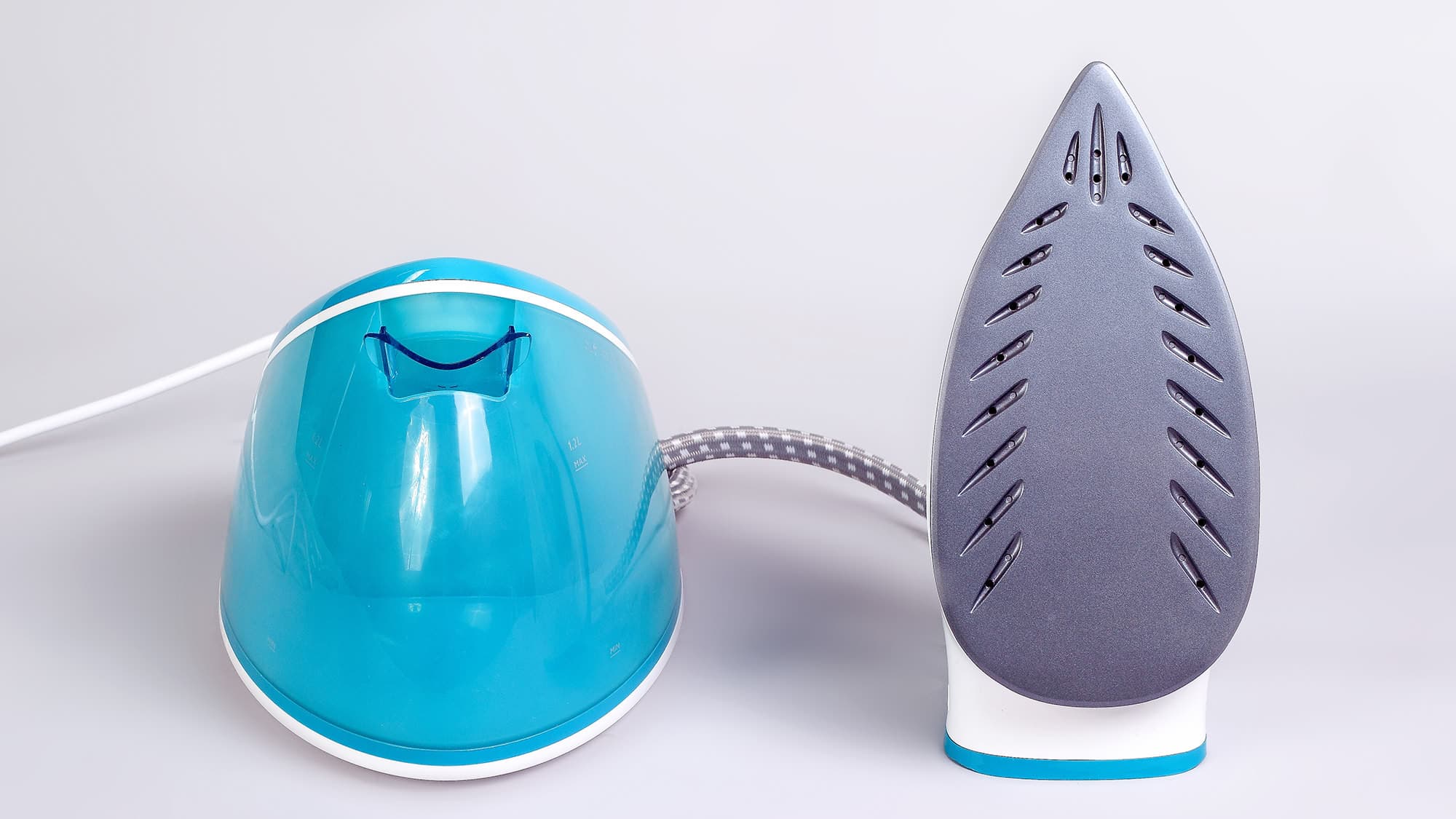 Контейнер: синего цвета, большой, легкий, устойчивый. Отверстие для залива воды расположено сверху базы, под носиком утюга. Крышка отверстия откидывается вниз без усилия. Сбоку на контейнере нанесены риски с указанием максимального и минимального уровня воды и указана ёмкость резервуара: 1,2 литра.