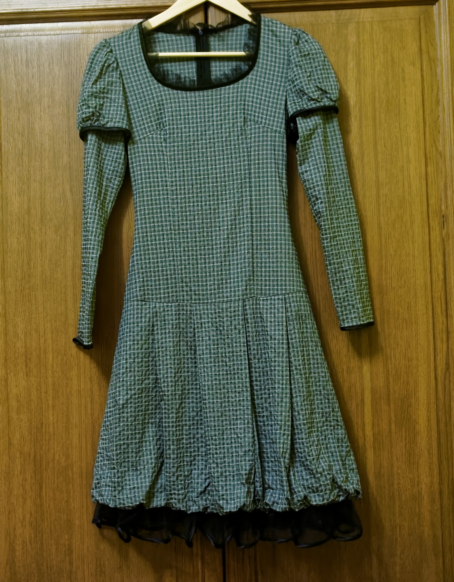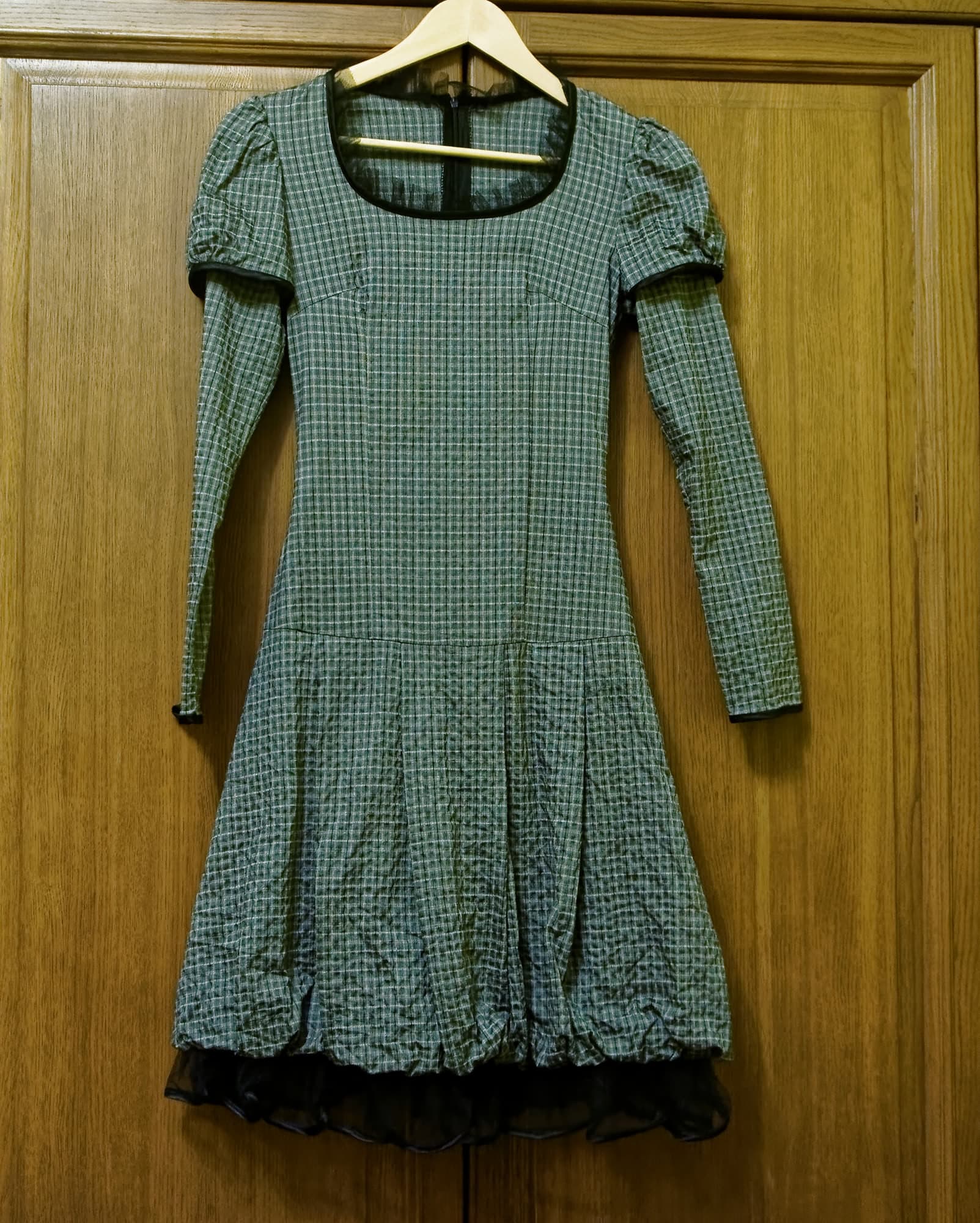 Сложного фасона вещь, обычным контактным способом разгладить которую почти нереально. Впрочем, наша подопытная паровая станция нам тоже не сильно помогла. Рюши чуть набрали форму, рукава расправились, но выглаженной вещью от этого платье не стало. Во время отпаривания утюг опять слегка подтекал.