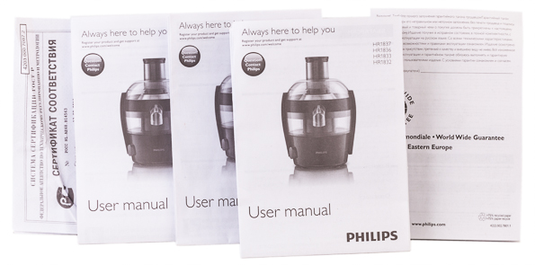 Инструкция к модели Philips HR1832 представляет собой гигантскую бумажную простыню, сложенную в шестнадцать раз, так что пользоваться ею не очень удобно. Комплектация, правила безопасности, ненужные «Факты об овощах и фруктах», — в общем, никакой особой практической нагрузки инструкция не несет.