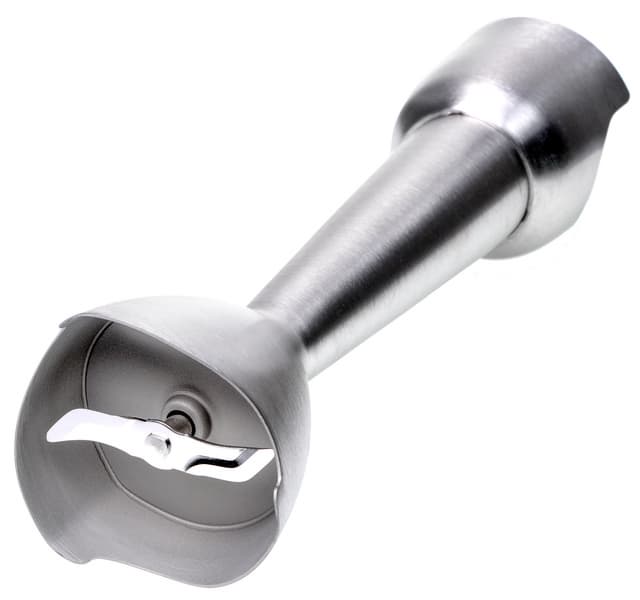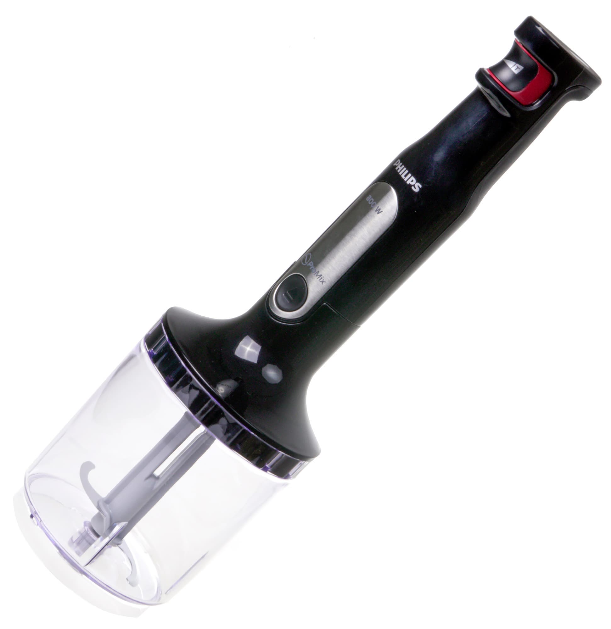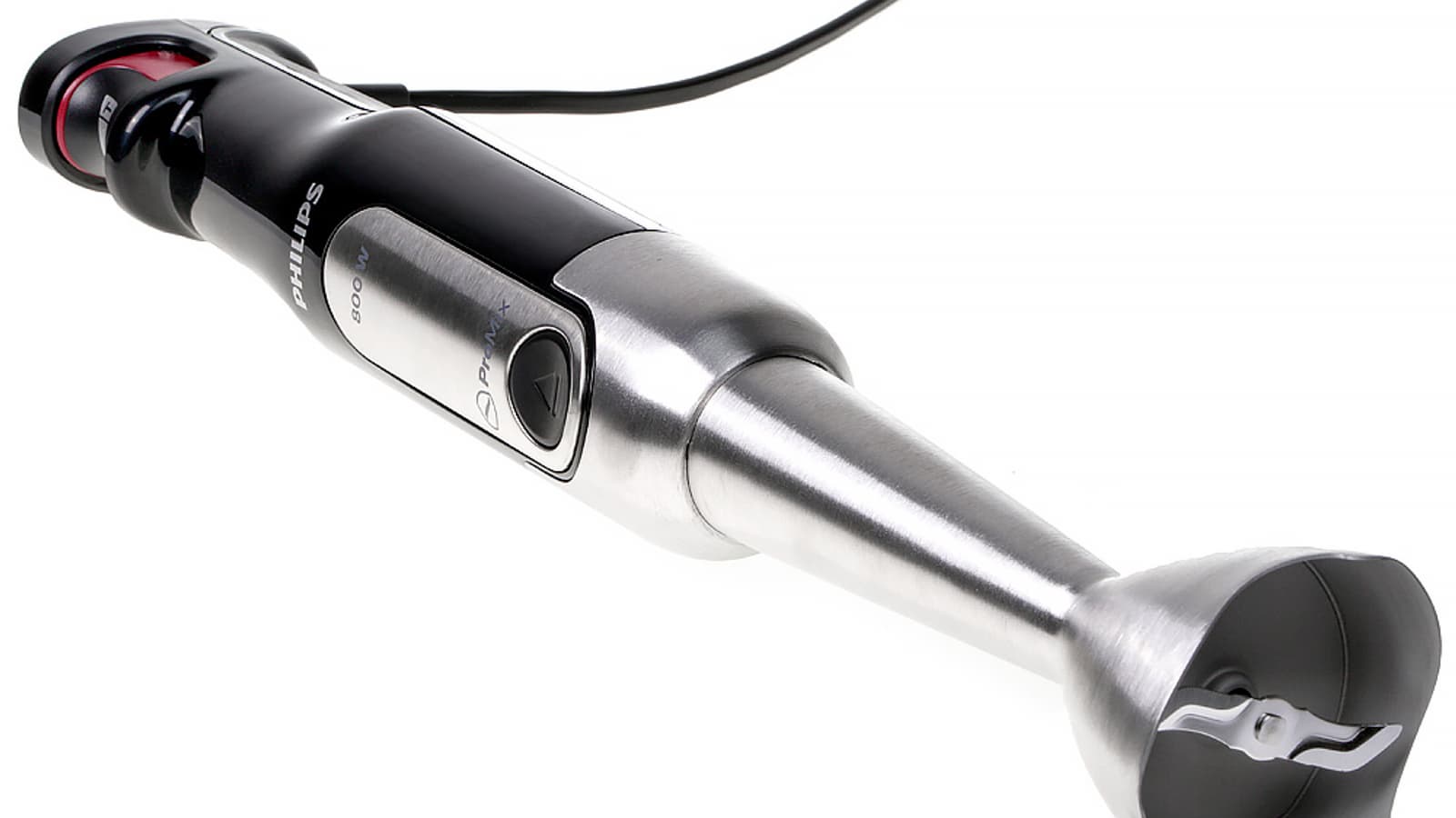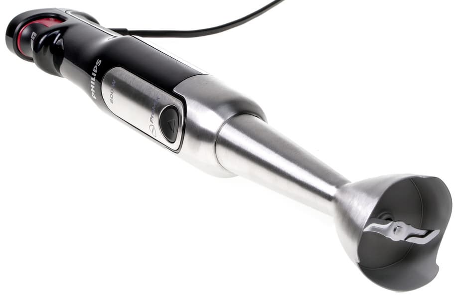 Насадка блендера выполнена из матовой нержавеющей стали. Ножи расположены на одной оси. Купол насадки треугольный — Philips заявляют, что такая форма обеспечивает оптимальный поток продуктов и более качественное их измельчение и смешивание.