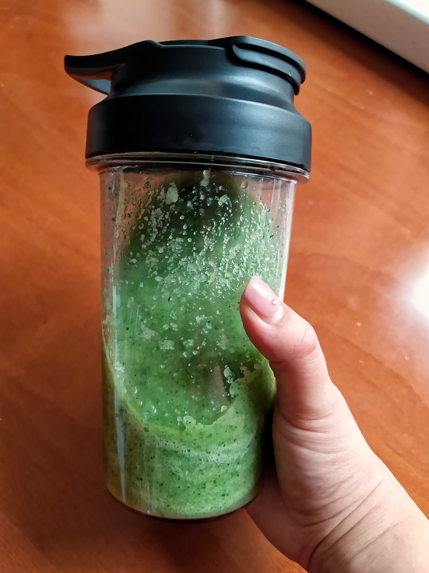 Блендер справился отлично: все составляющие объединились в однородную массу, ни следа даже от грубых волокон сельдерея (мы специально их не удалили, чтобы усложнить задачу). Получился отличный освежающий коктейль с легкой яблочно-лаймовой кислинкой. Закрыли крышкой, закрепили клапан, чтобы она случайно не открылась в сумке — можно идти по делам!