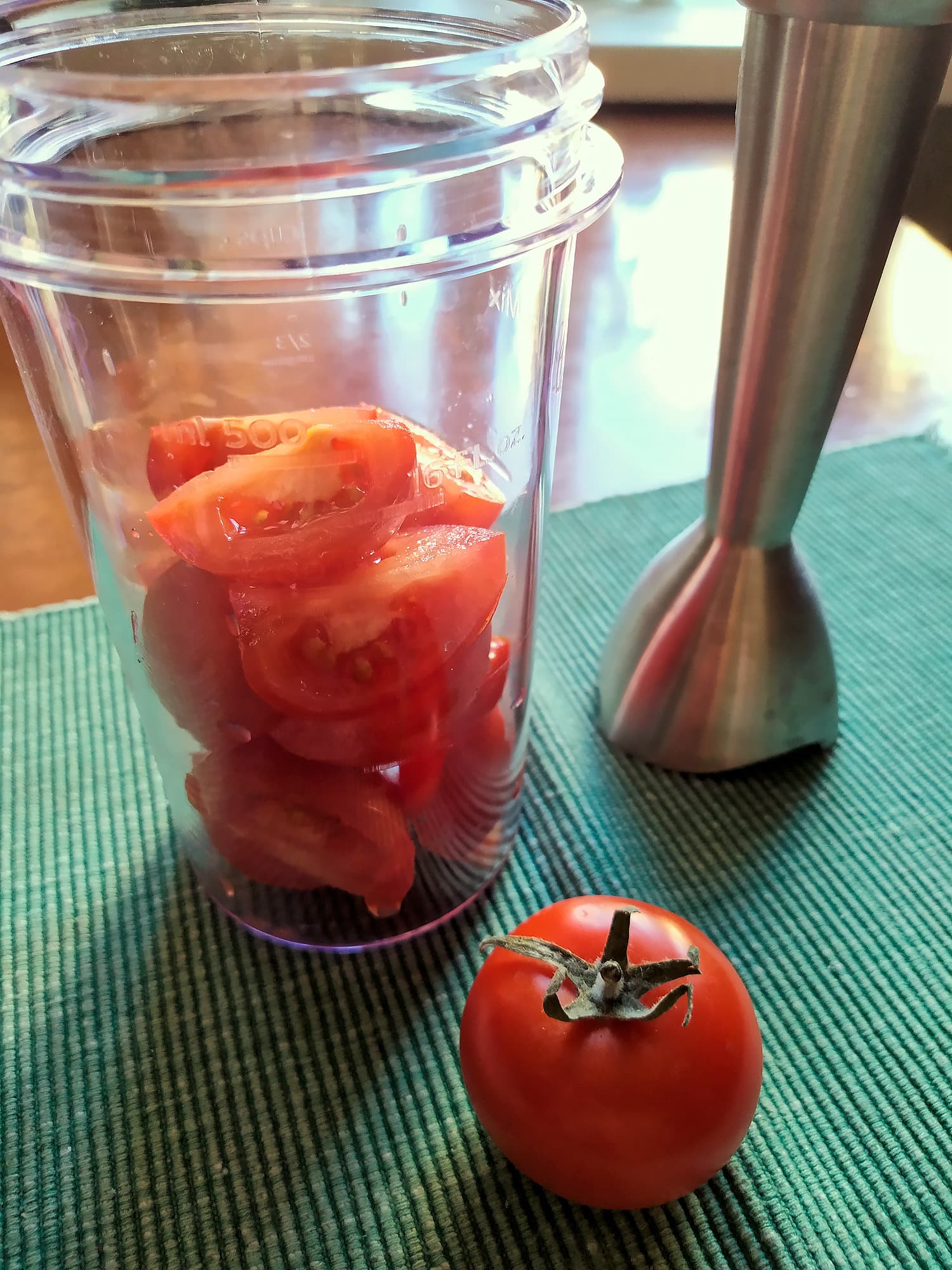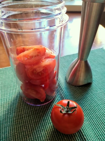 Несколько помидоров порезали на четвертинки и отправили в стакан для смешивания, заполнив его до отметки 400 мл.