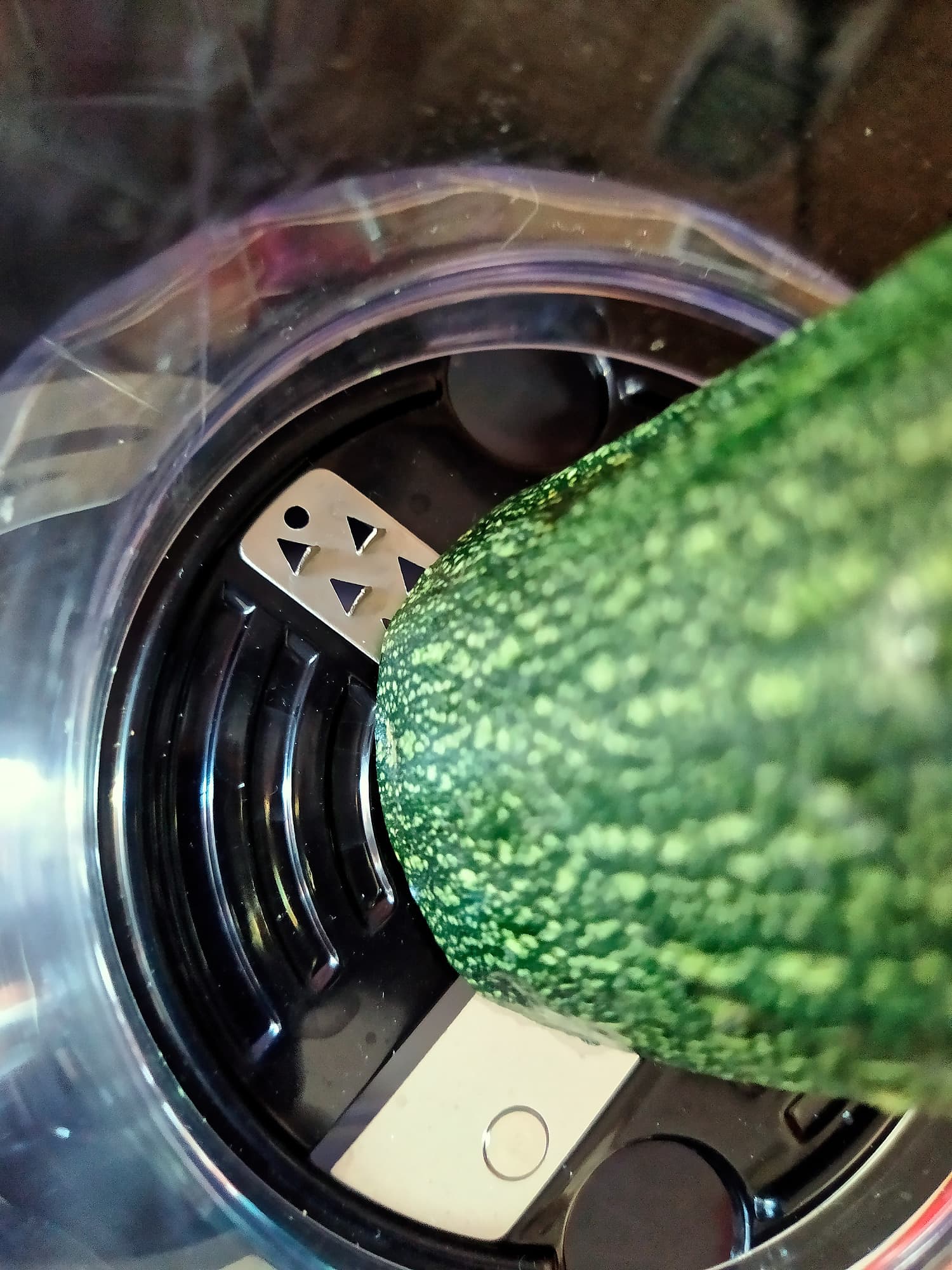 Взяли терку, предназначенную для самой тонкой нарезки, небольшие цукини порезали поперек на три «поленца», надавили сверху толкателем-ножом и, как советует инструкция, включили блендер на первой мощности.