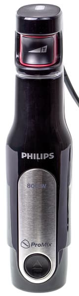 Увесистый моторный блок изготовлен в основном из черного пластика. Две части пластиковой облицовки корпуса соединяются по бокам, между ними небольшой зазор чуть меньше миллиметра. На лицевой стороне — вставка из нержавеющей стали, на ней расположена кнопка фиксации насадок. Здесь же мы видим максимальную мощность работы прибора (800 Вт) и напоминание о технологии ProMix. В зоне захвата корпус сужен и частично покрыт нескользящей резиной. Там же находится кнопка управления с технологией SpeedTouch, позволяющей контролировать скорость вращения ножей силой нажатия. На верхнем торце блока находится индикатор мощности. Сзади прикреплен шнур электропитания, петли для подвешивания на нем нет.