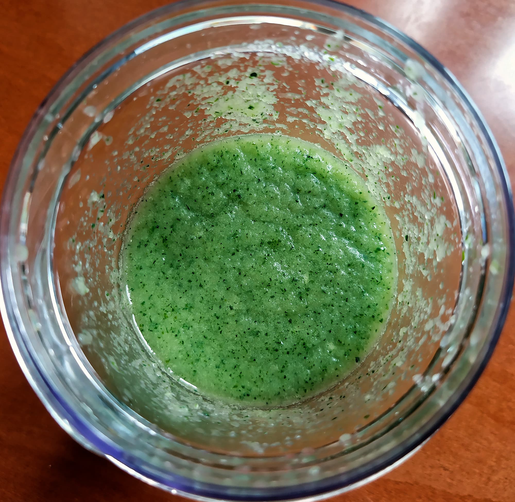 Порезали фрукты-овощи небольшими кусочками, плеснули полстакана воды, добавили щепотку гималайской соли, сок лайма и немного оливкового масла. Орудовали блендером 40 секунд.