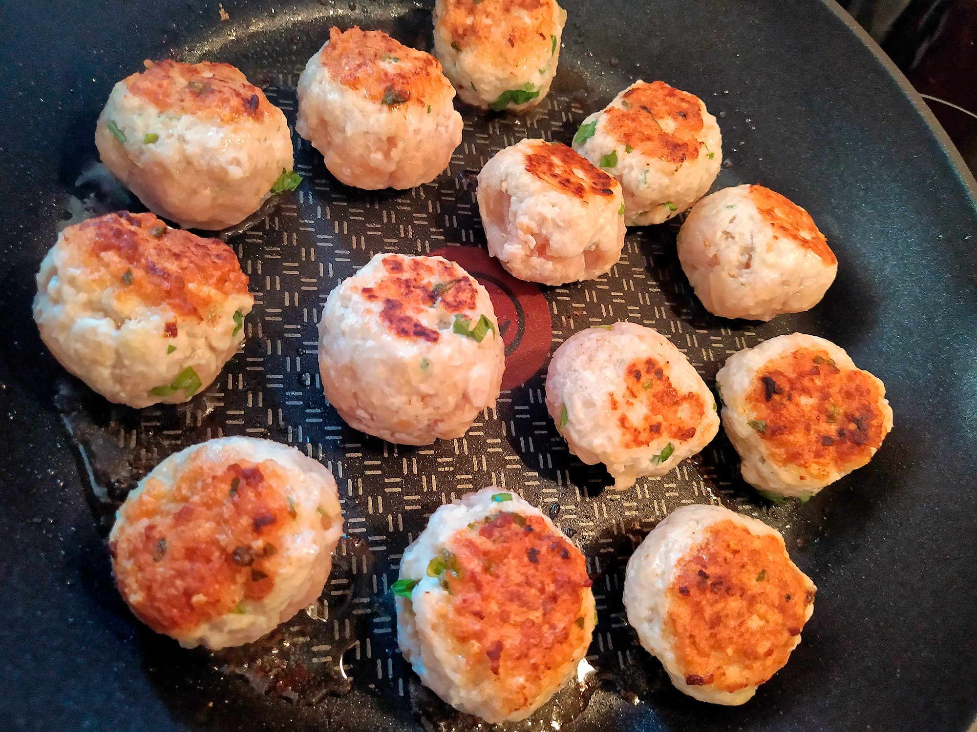 Индейку смешали с молотыми сухарями, добавили яйцо, пармезан, петрушку, чеснок, соль и перец. Из полученного фарша сформовали фрикадельки и обжарили их до аппетитной корочки.