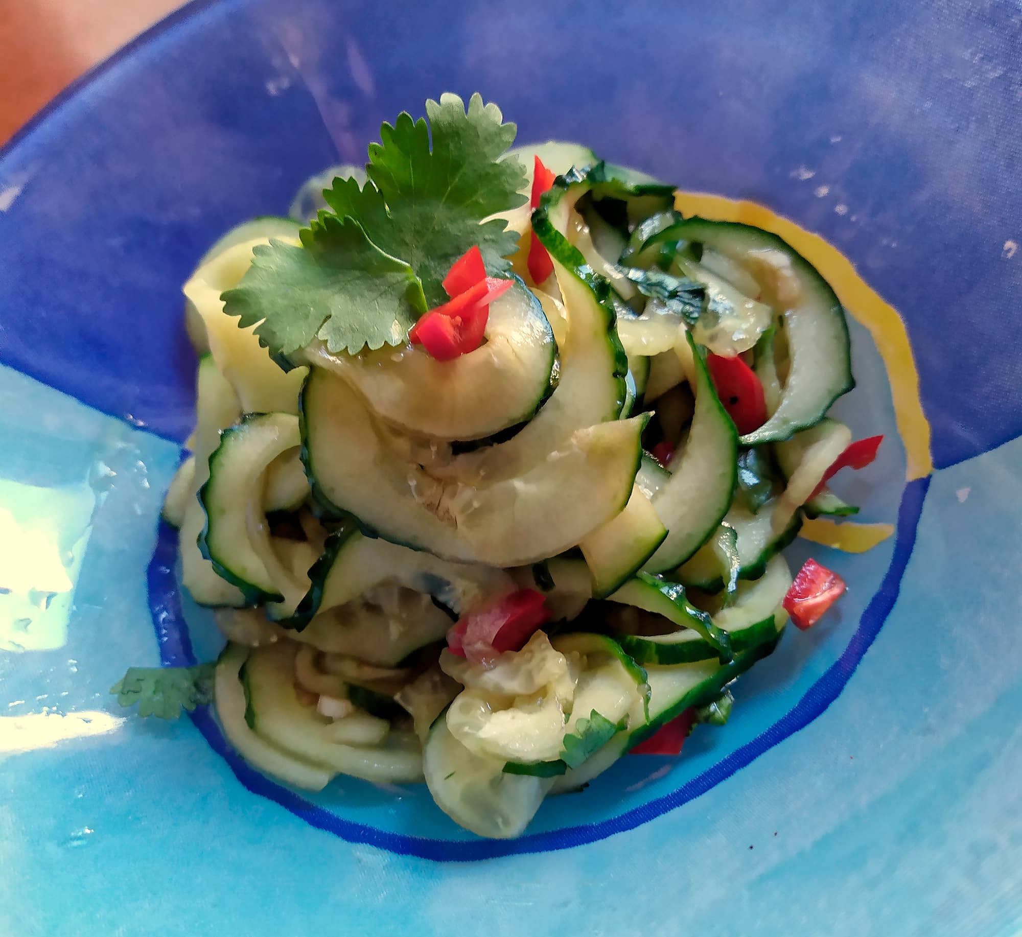 Таким образом нарезали 2 огурца, добавили к ним чеснок, рисовый уксус, соевый соус и немного коричневого сахара и отправили в холодильник на 10 минут. Огуречная лапша отлично пропиталась маринадом. Перед подачей добавили кинзу и мелко порезанный красный острый перец.