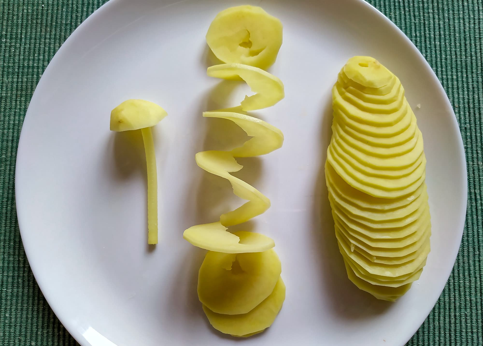 На этой насадке толщина полосок — чуть больше сантиметра. Как видно на фото, картофель немного ломается на сгибах, и все же сохраняет форму спирали. Одну картофелину мы даже умудрились нарезать целиком — не было ни одного разрыва!