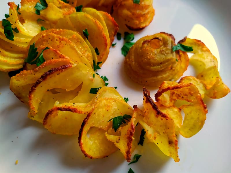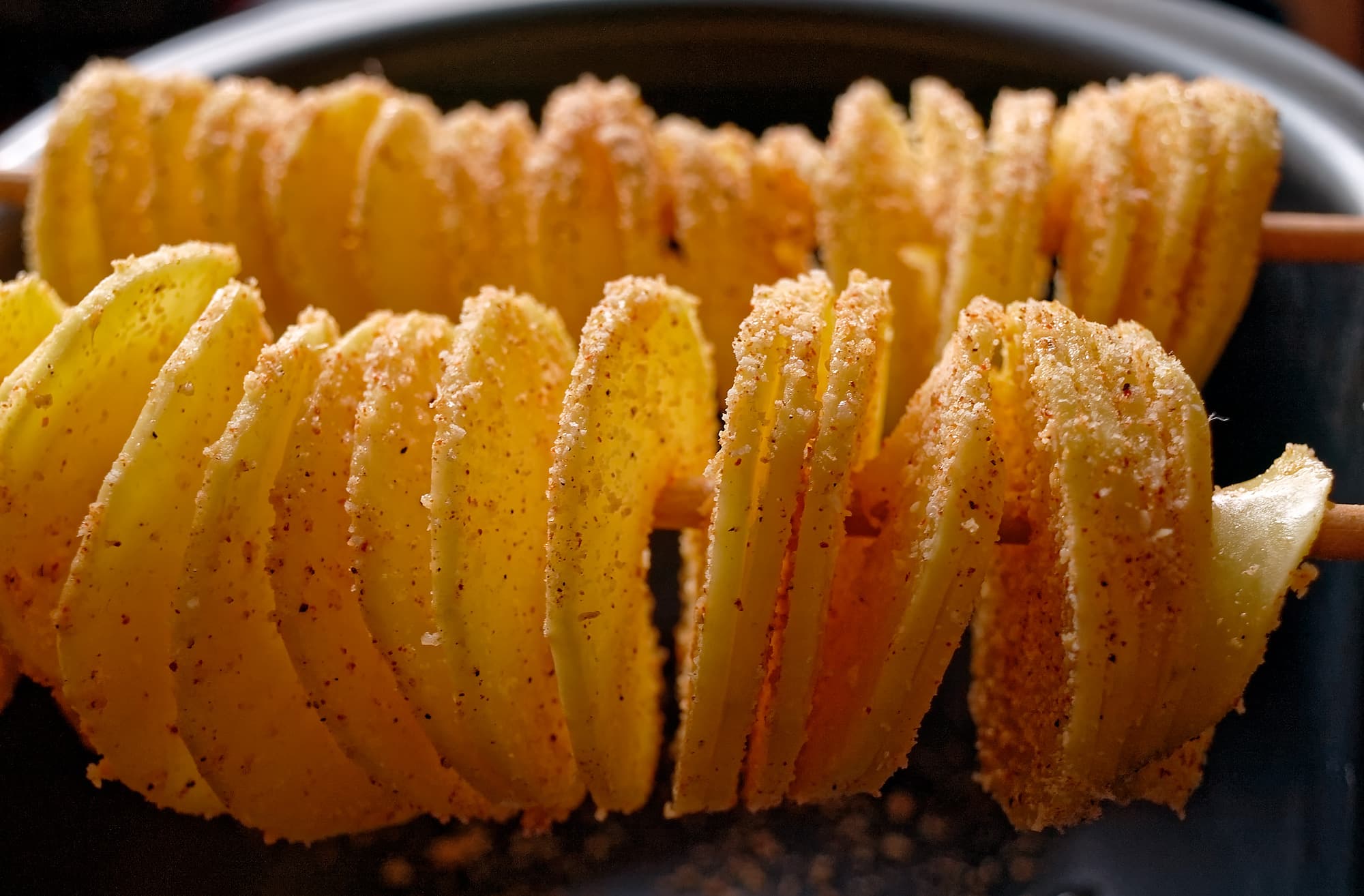 Спираль — не самая привычная форма продуктов на кухне, так что пришлось пораскинуть мозгами, придумывая, как бы ее приспособить, если не в салат или гарнир. Вспомнили! Есть же замечательный корейский стрит-фуд, картофель «торнадо». В ход идет насадка для «папарделле».