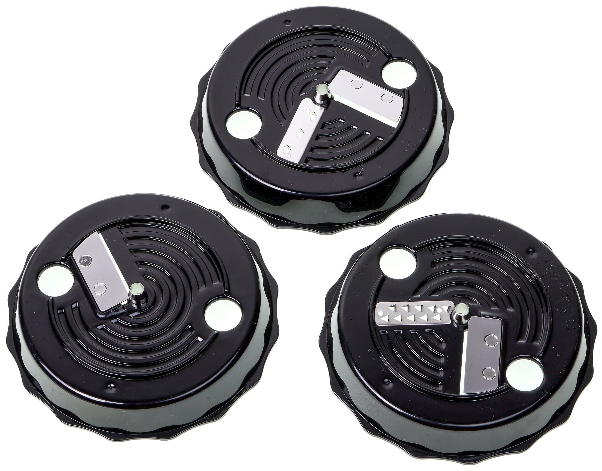 Терки представляют собой черные диски со стальными вставками-ножами. По центру небольшое выступающее кольцо: на нем закрепляется измельчаемый продукт. Нигде не обозначено, для какого типа нарезки предназначена каждая насадка, но легко догадаться. Очевидно, что большой плоский нож срезает с овоща широкую пластину, а затем она разрезается на части с помощью второй вставки с треугольными зазубринами — чем их больше, тем тоньше нарезка. Итак, на фото: вверху — терка для лингвини, внизу слева — для широких спиралей, внизу справа — для спагетти.
